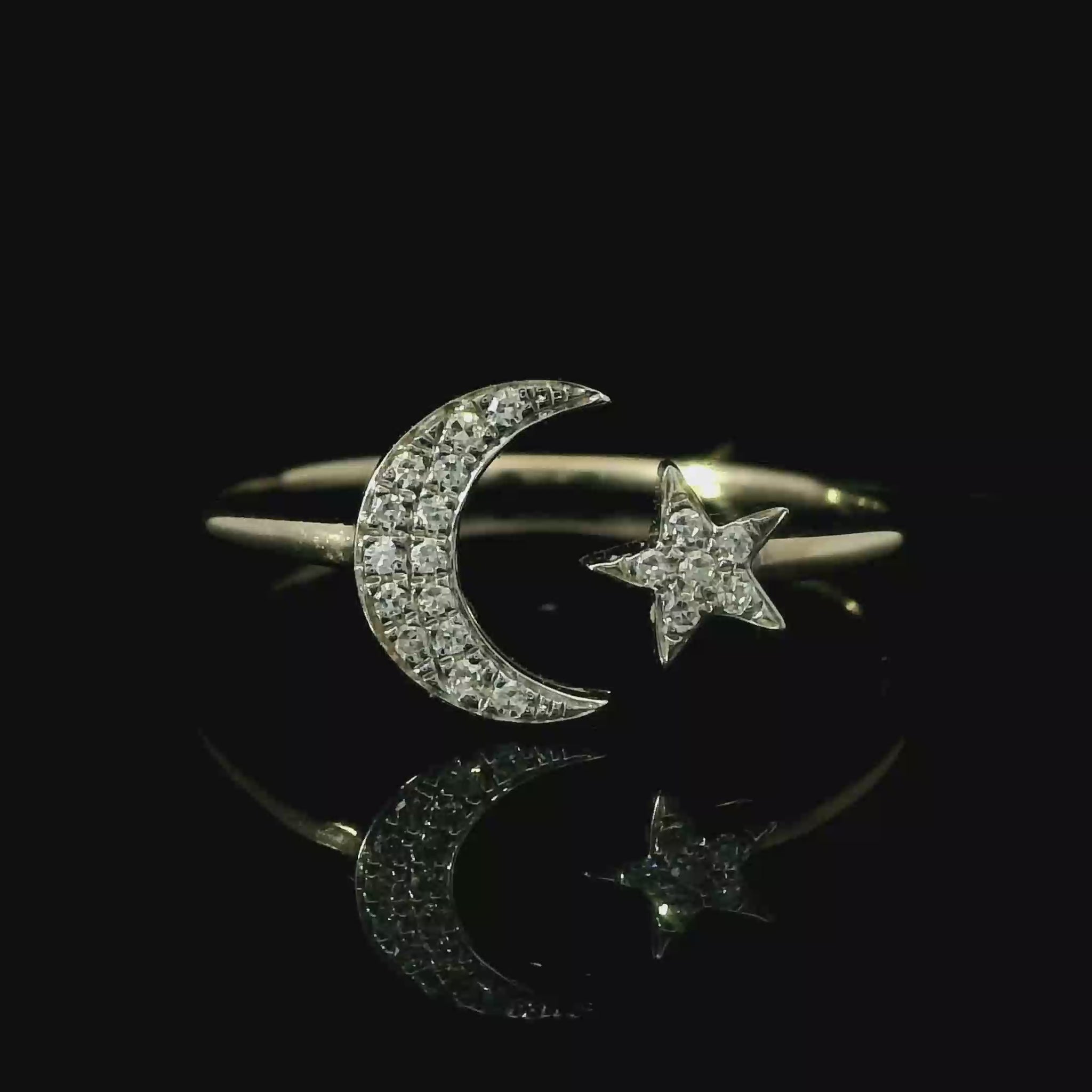Shine like the night sky with this enchanting Diamond Moon and Star Ring, beautifully handcrafted in solid 14K two-tone white and yellow gold. The elegant open design features a crescent moon and a shimmering star — both adorned with natural pavé-set diamonds that radiate soft, celestial brilliance.
