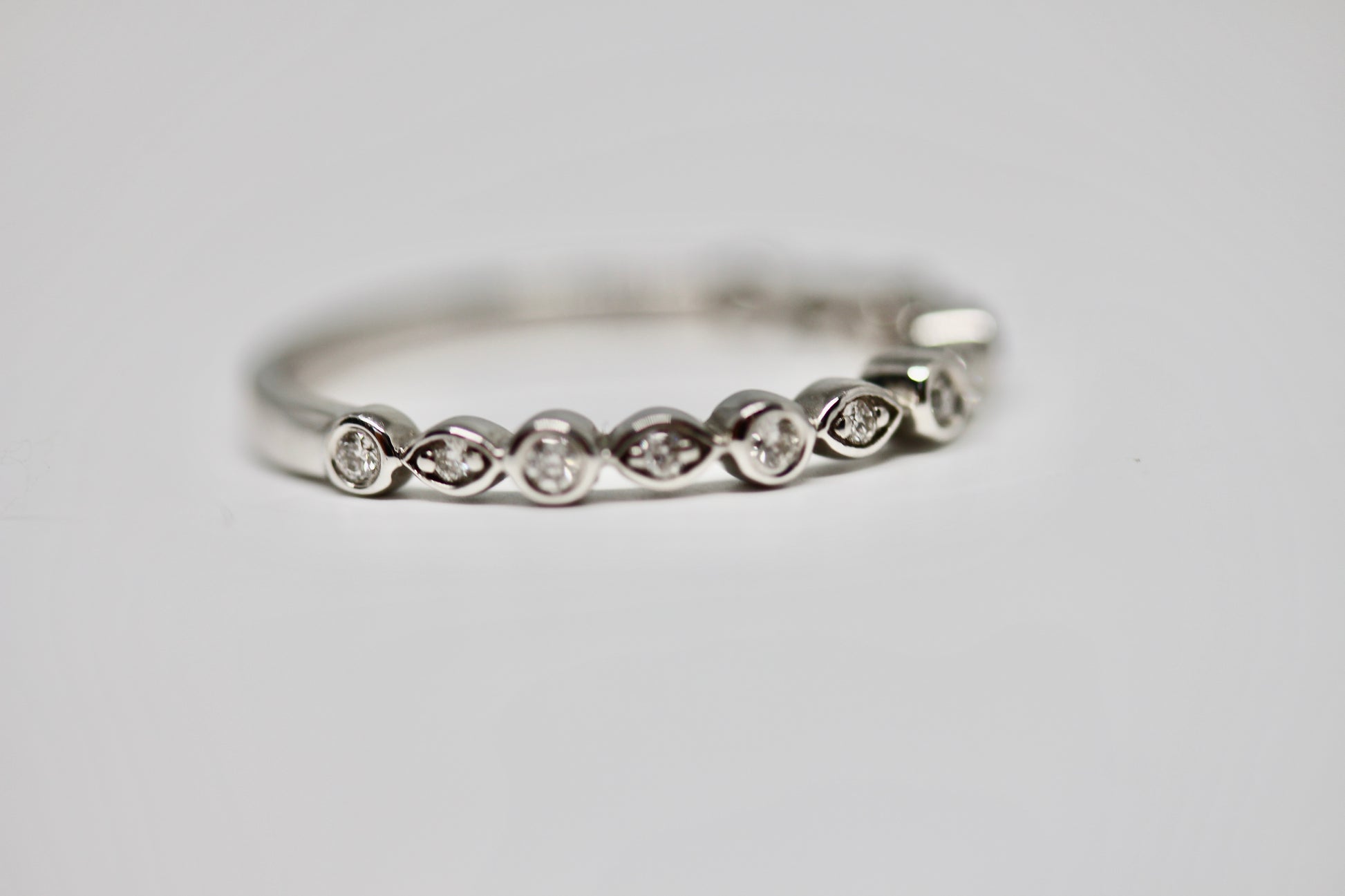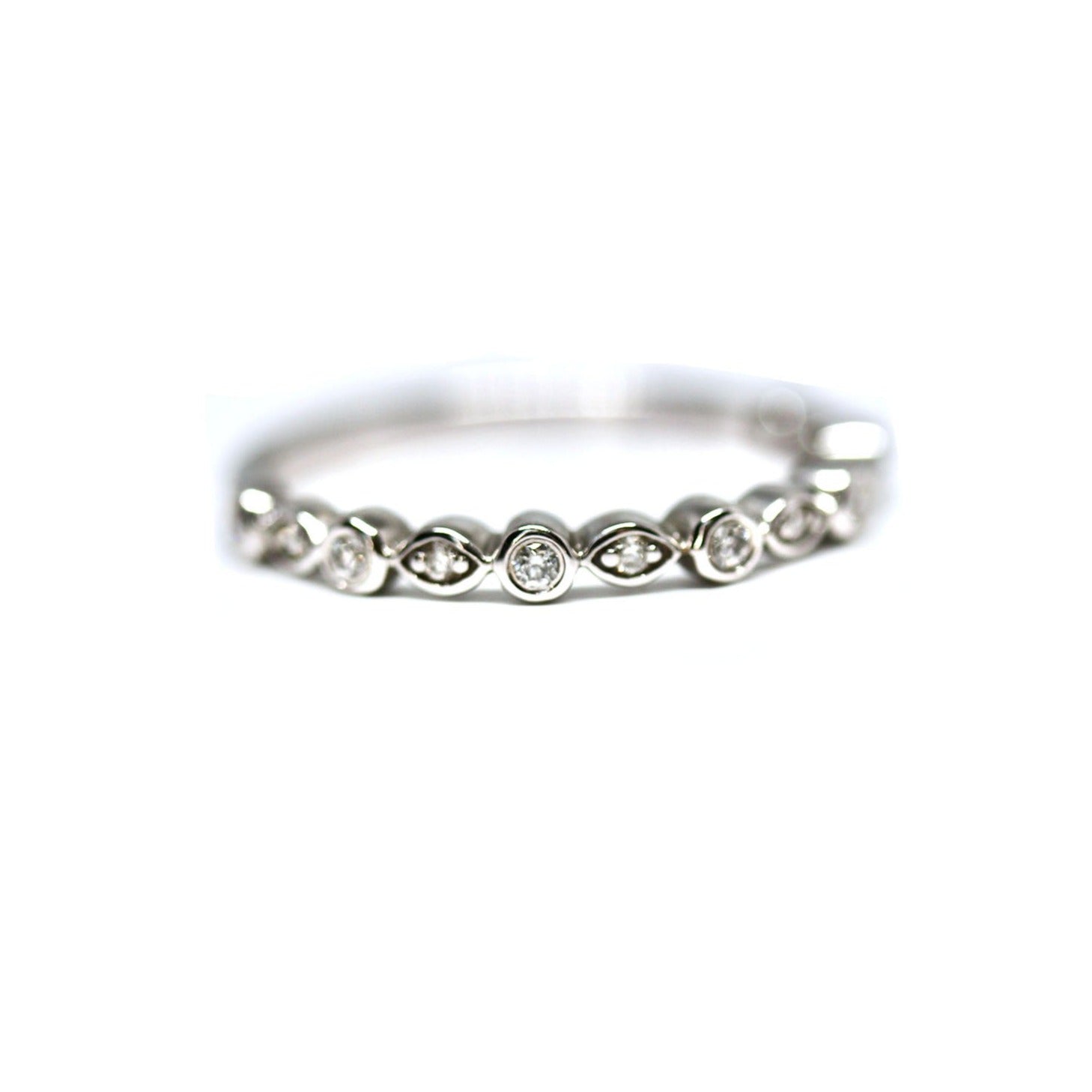 This stackable/wedding band has 13 round brilliant cut diamonds bead and bezel set in an alternating round and marquise style.