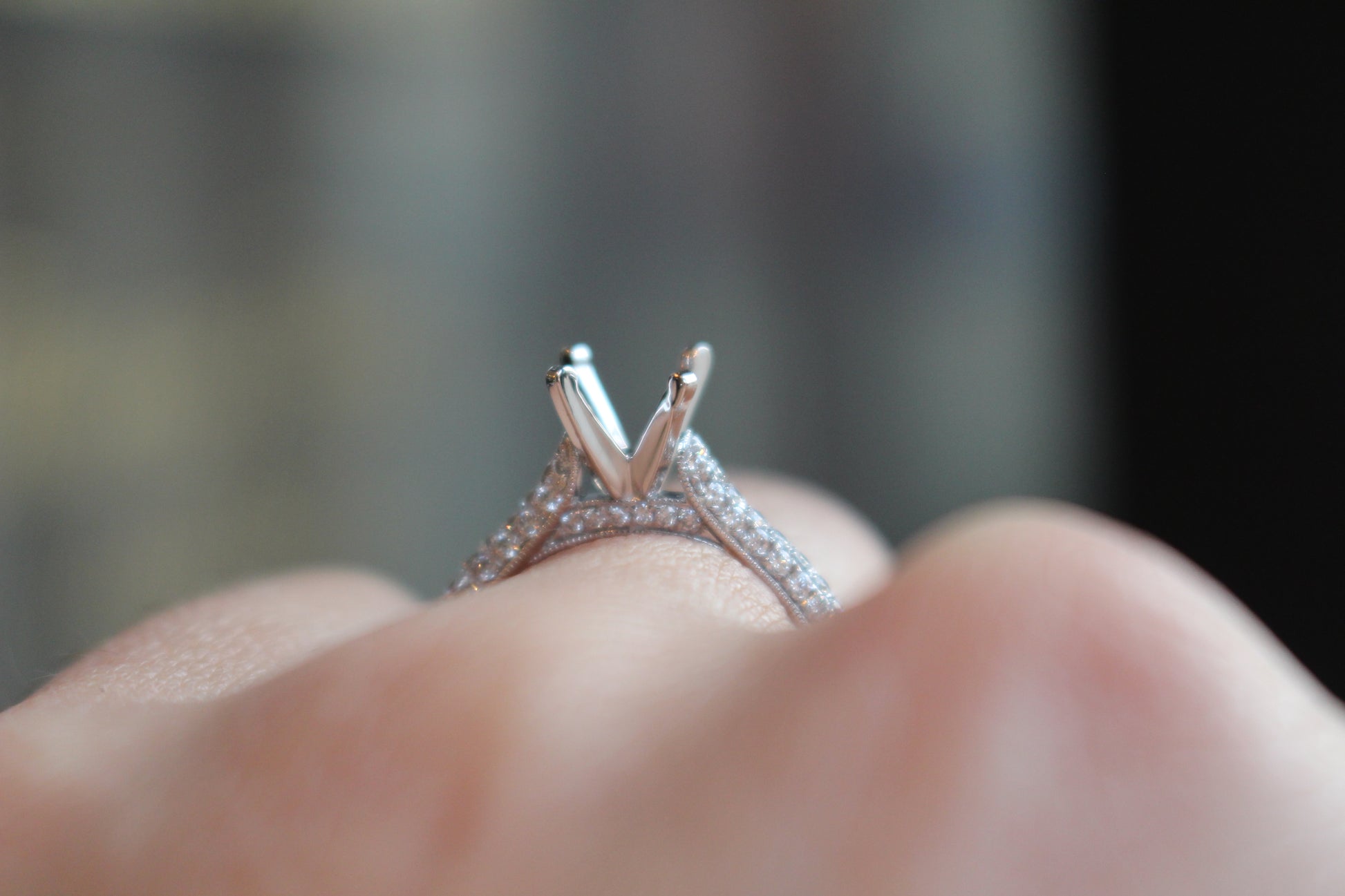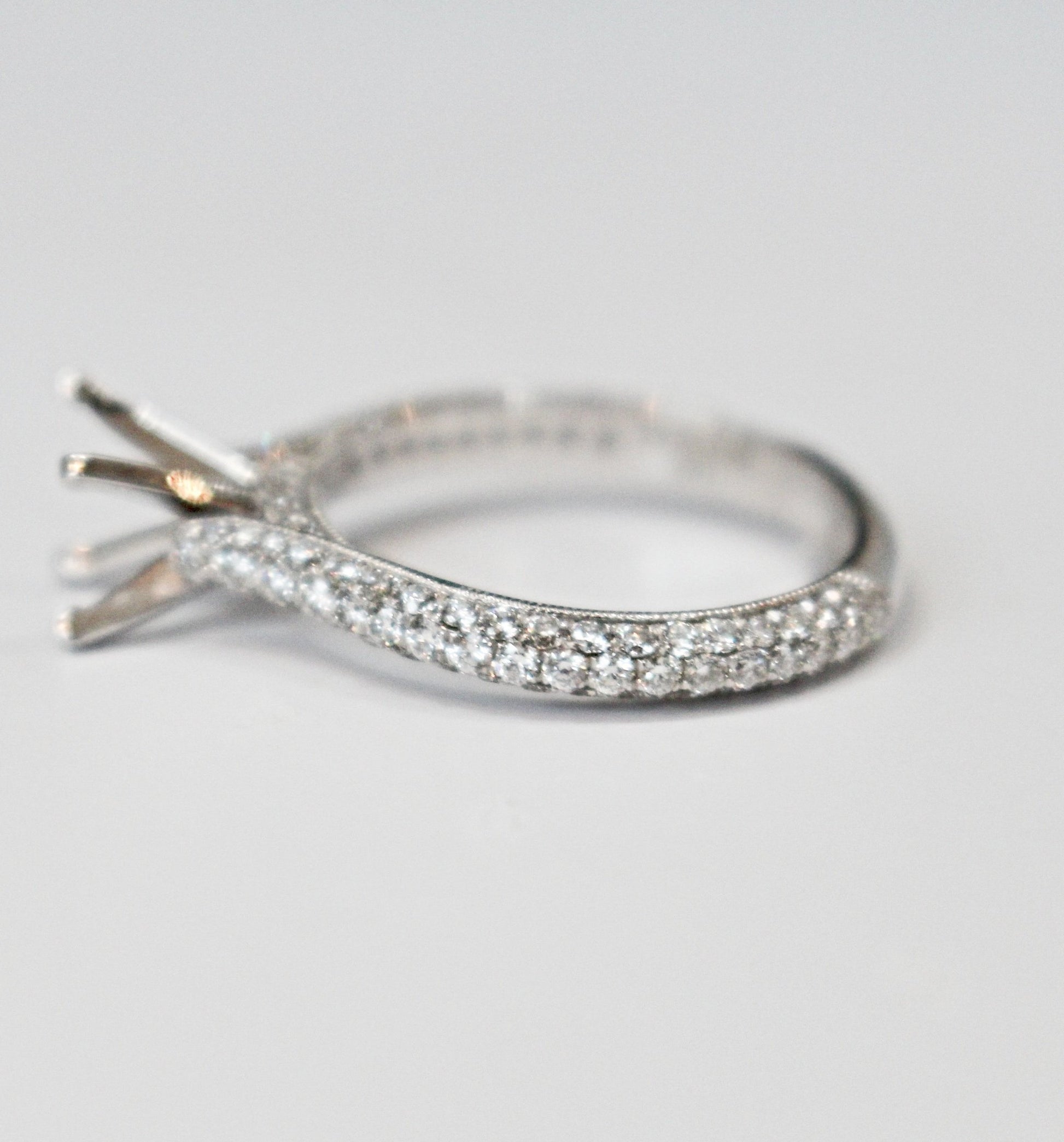 This engagement ring has 116 round brilliant cut diamonds that are pave set throughout the band. You can see diamonds from every angle on this ring. There is also mil-grain added on both side profiles for extra detail. You can fit any shape in the center between the sizes of .50ct-3ct.