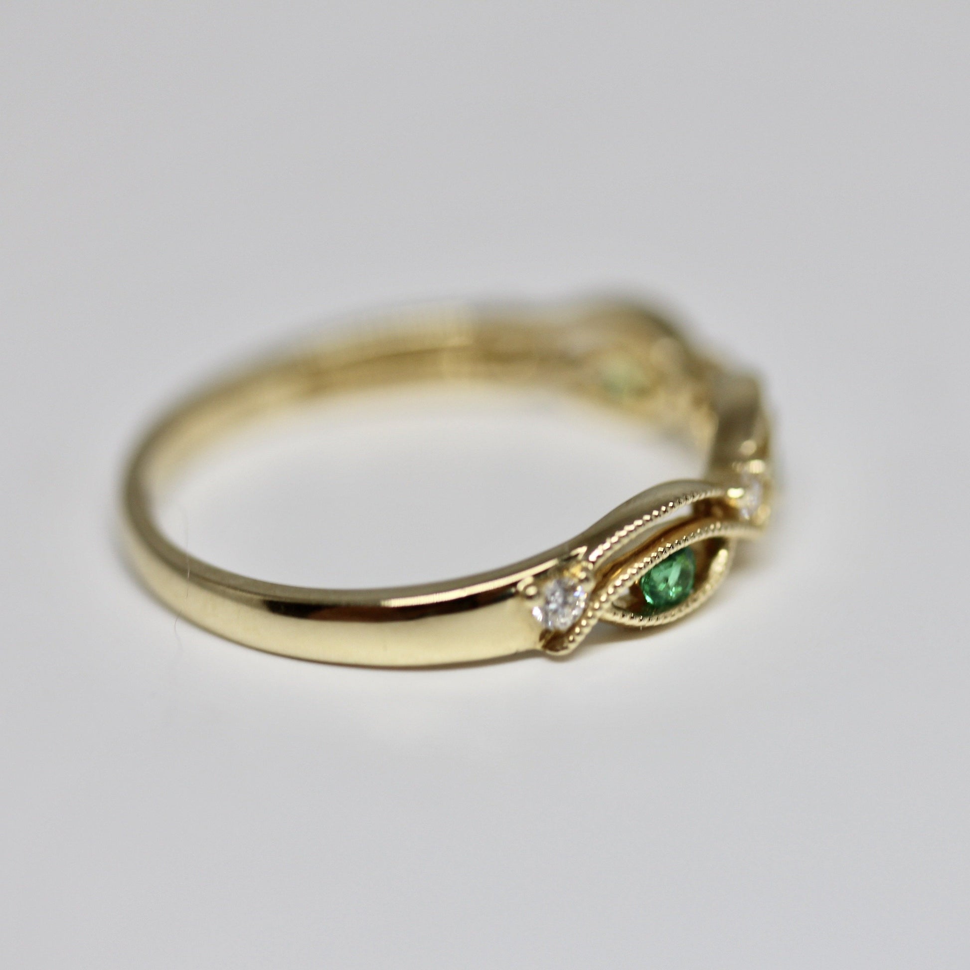 This stackable has 4 round brilliant cut diamonds alternating with 3 Round cut Emeralds. The ring has an Art Deco Style with some mil-grain surrounding each stone for an extra added vintage look.