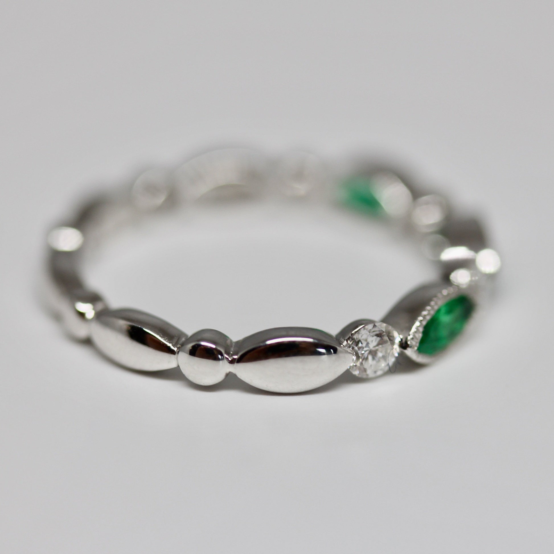 This stackable has 4 round brilliant cut diamonds alternating with 3 Emerald Cut Marquise. Each Emerald is bezel set with a mil-grain surrounding for an extra vintage look. Then the diamonds set between them look like they are floating.
