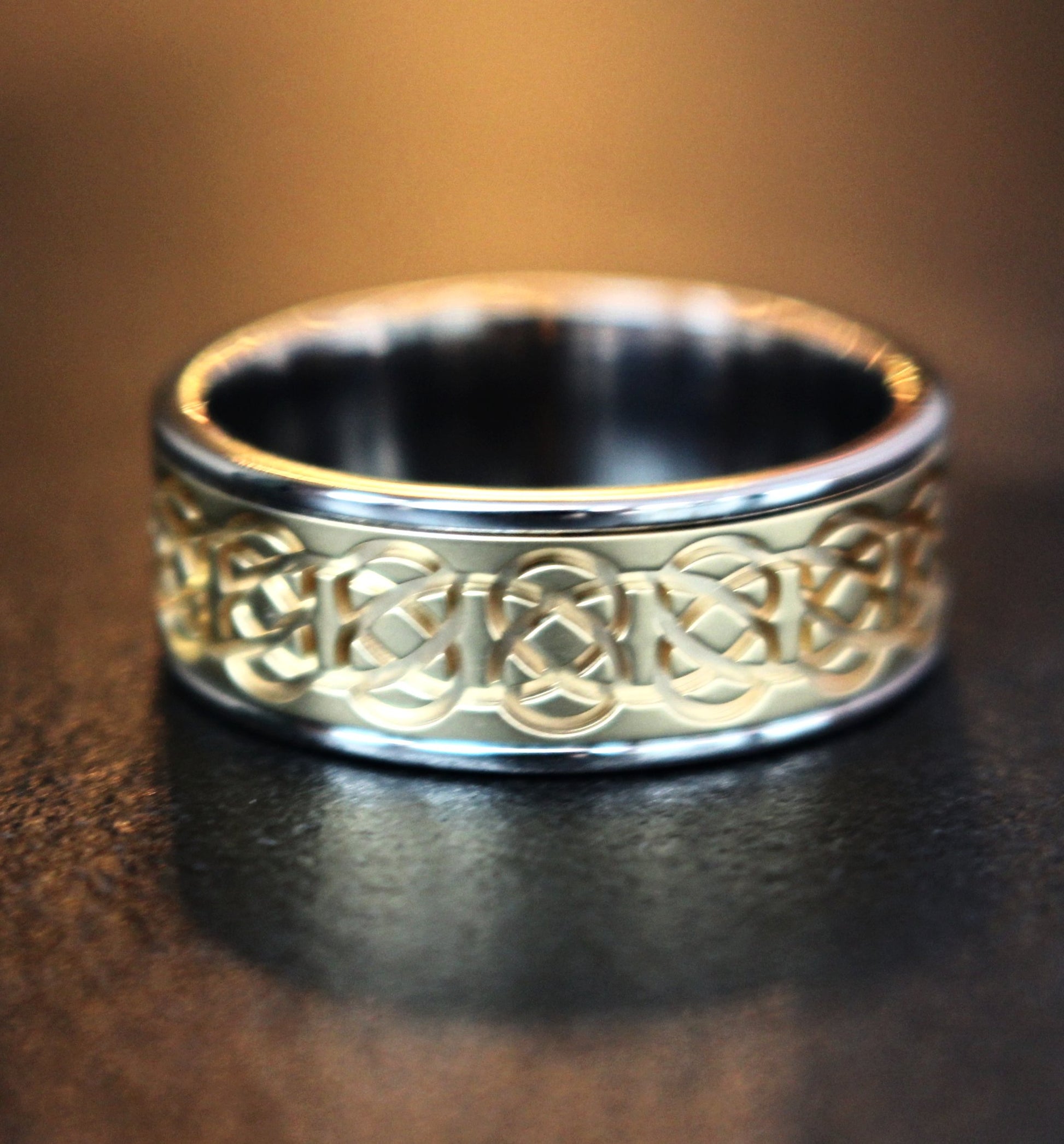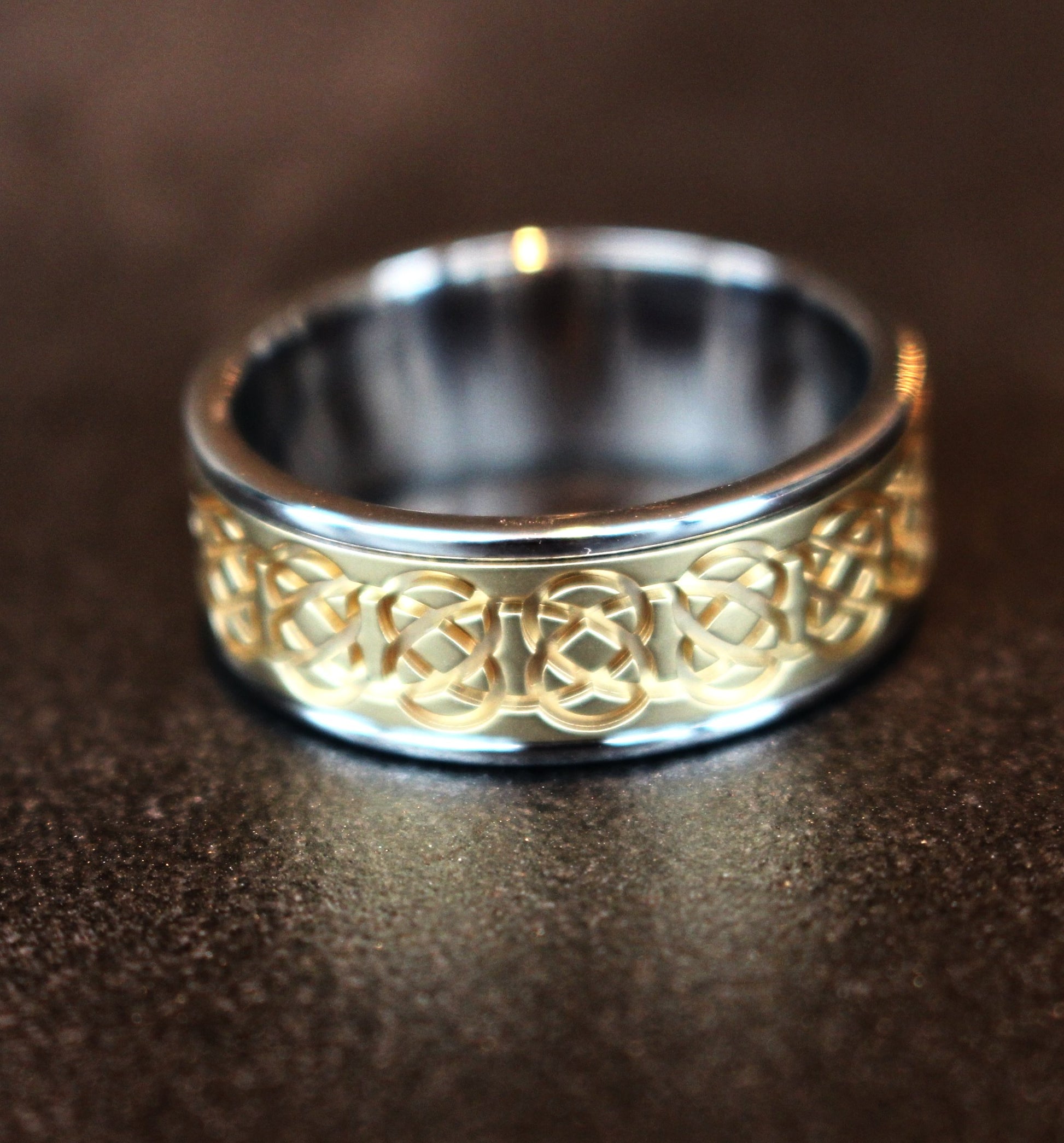 This is a Diamondaire Exclusive Men's Wedding Band with a carved out Celtic design in the center. The outside rims are rounded with a high polish finish and the center has a satin finish.