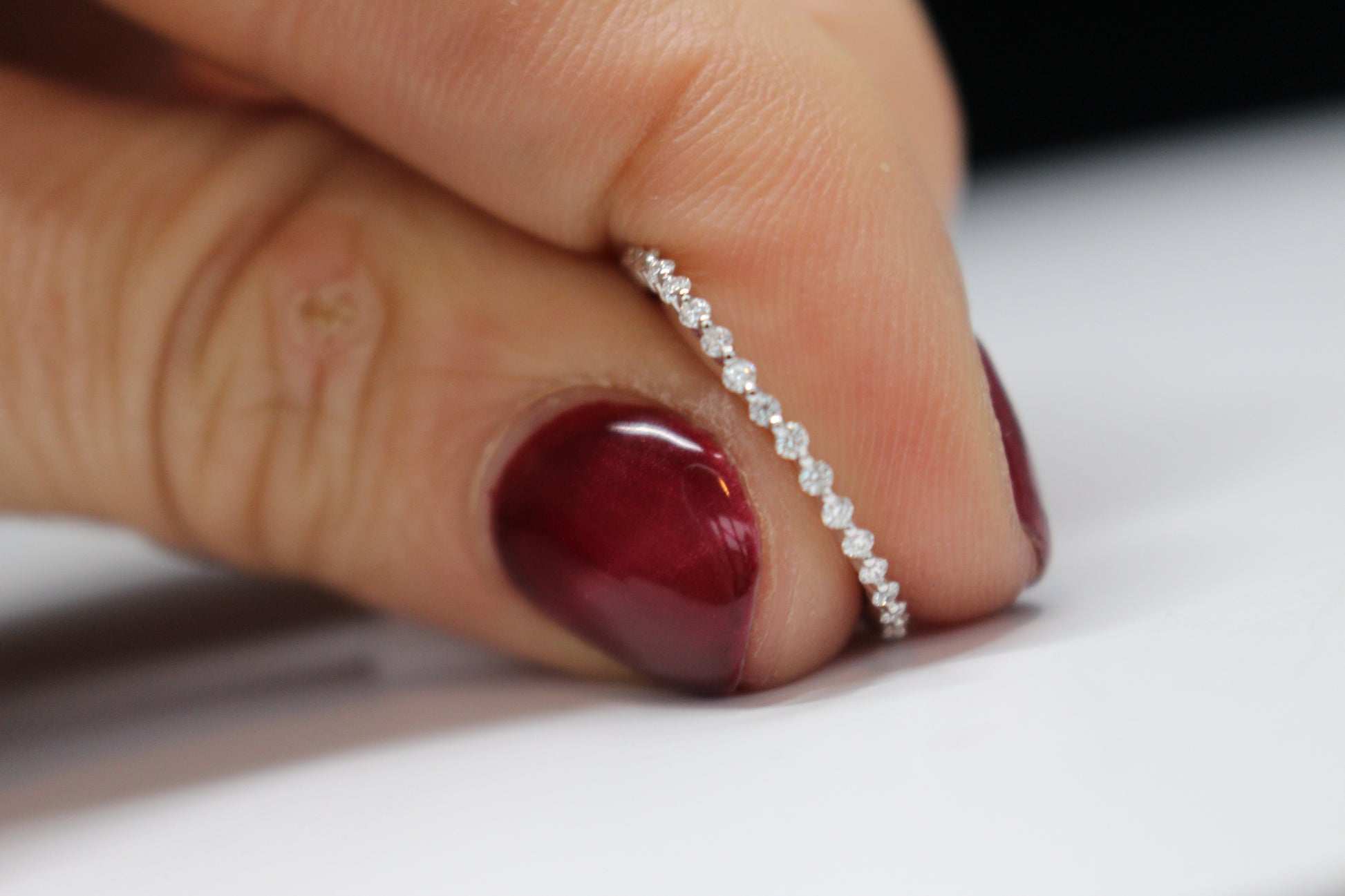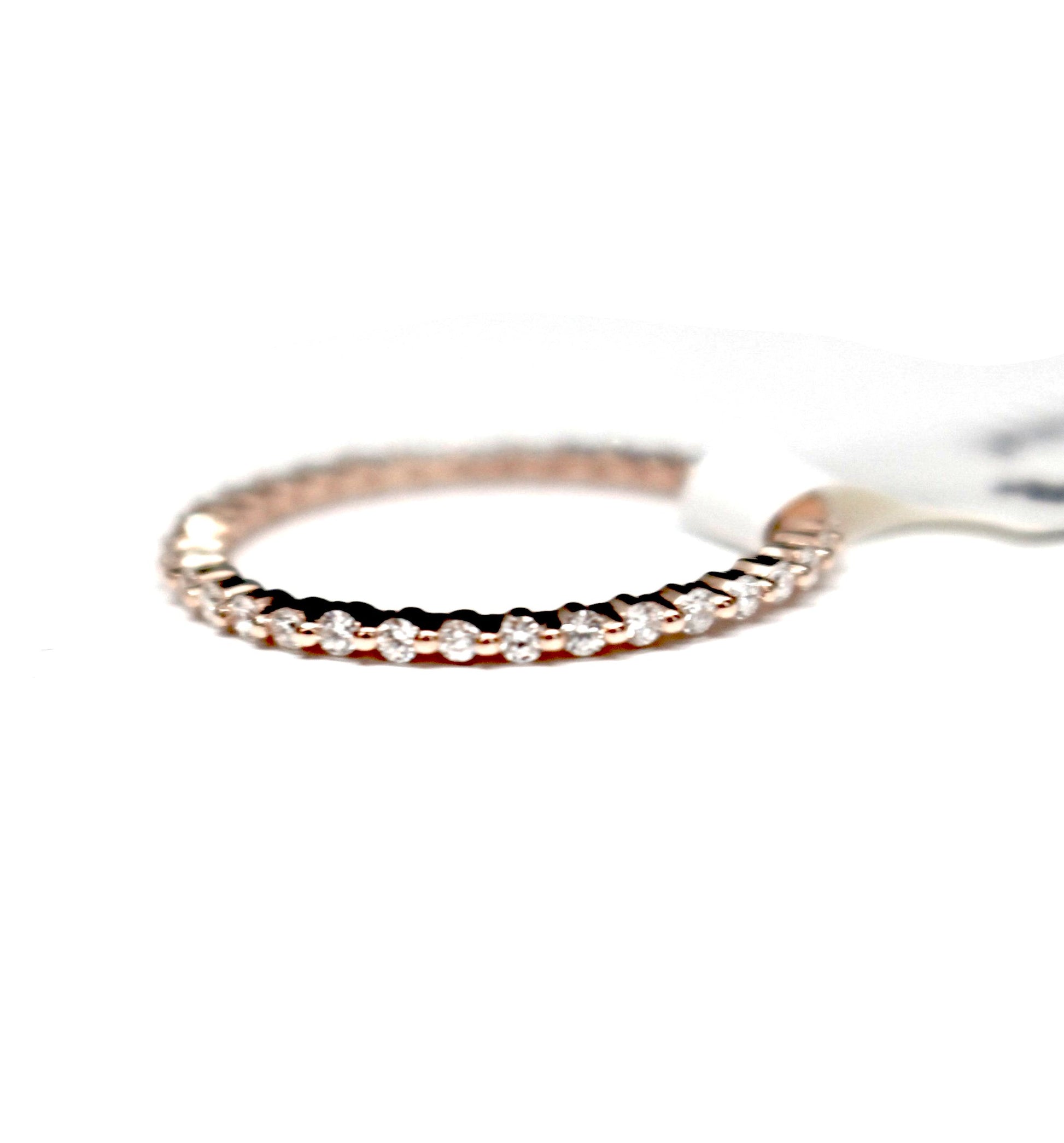 This stackable has 36 round brilliant cut diamonds set in a single shared prong style. The width of the band is about 1.3mm. All three metal colors are available for next day shipping in size 6.75. For other sizes please give us 10 days to make.