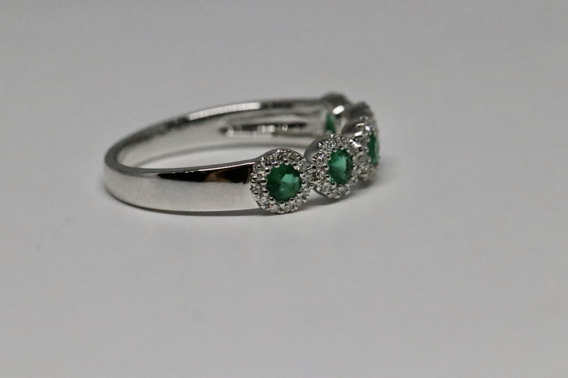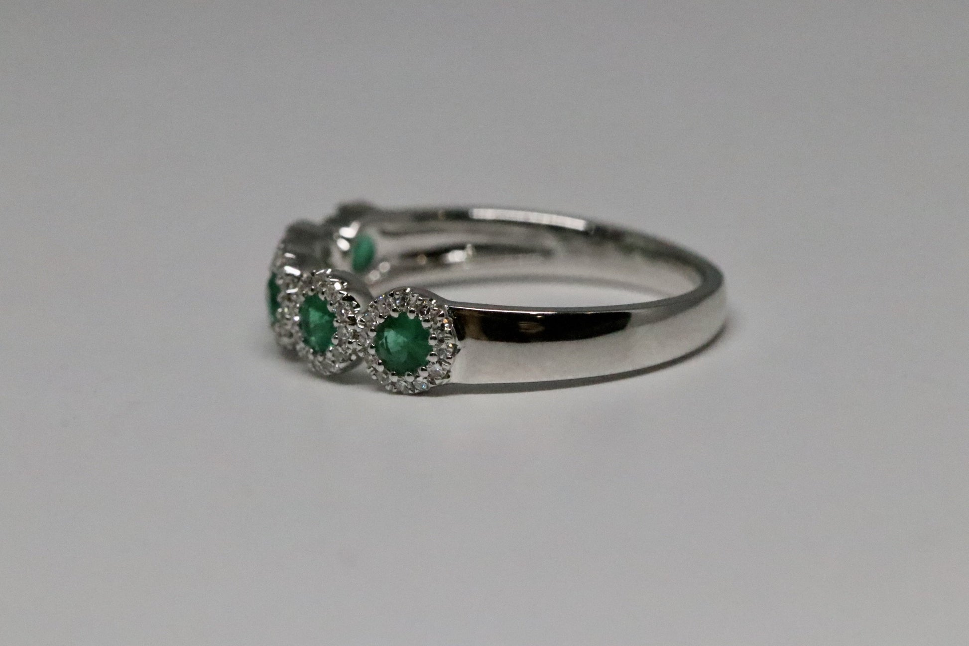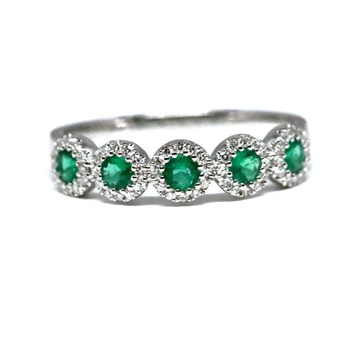 This band has 60 round brilliant cut diamonds shared prong-set surrounding 5 round emerald stones.