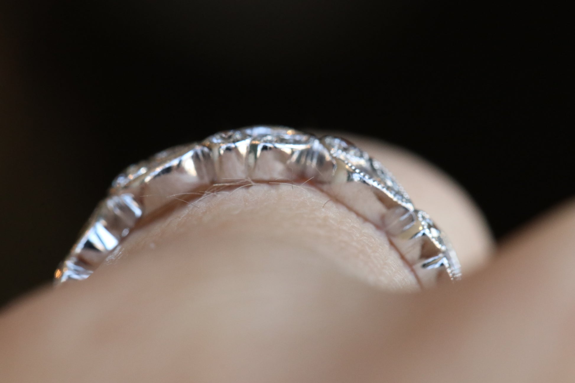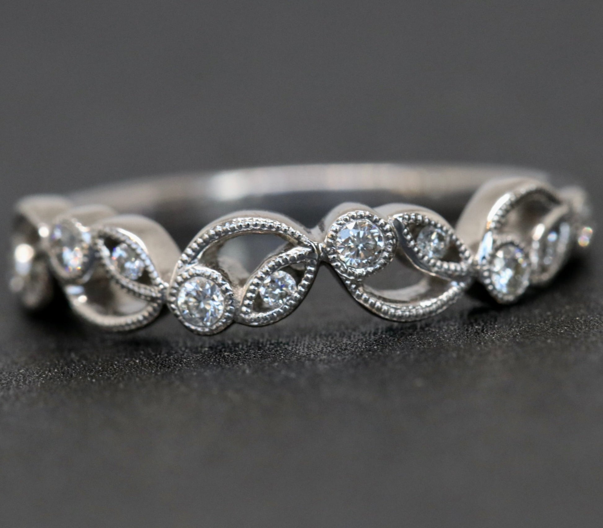 This floral stamped wedding band has 12 round brilliant cut diamonds set.