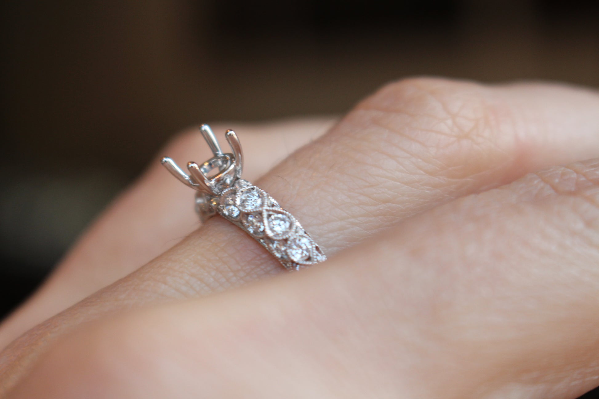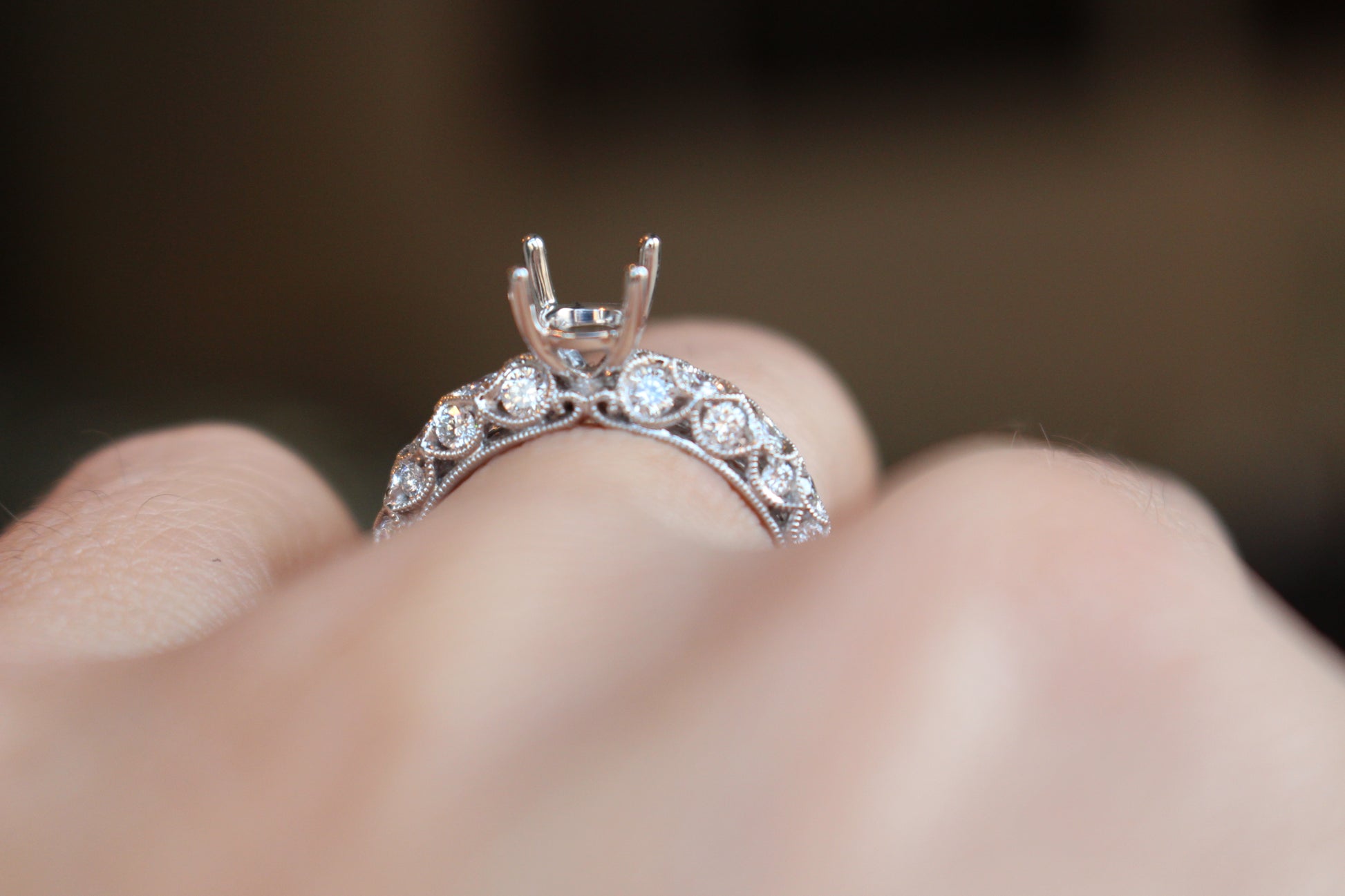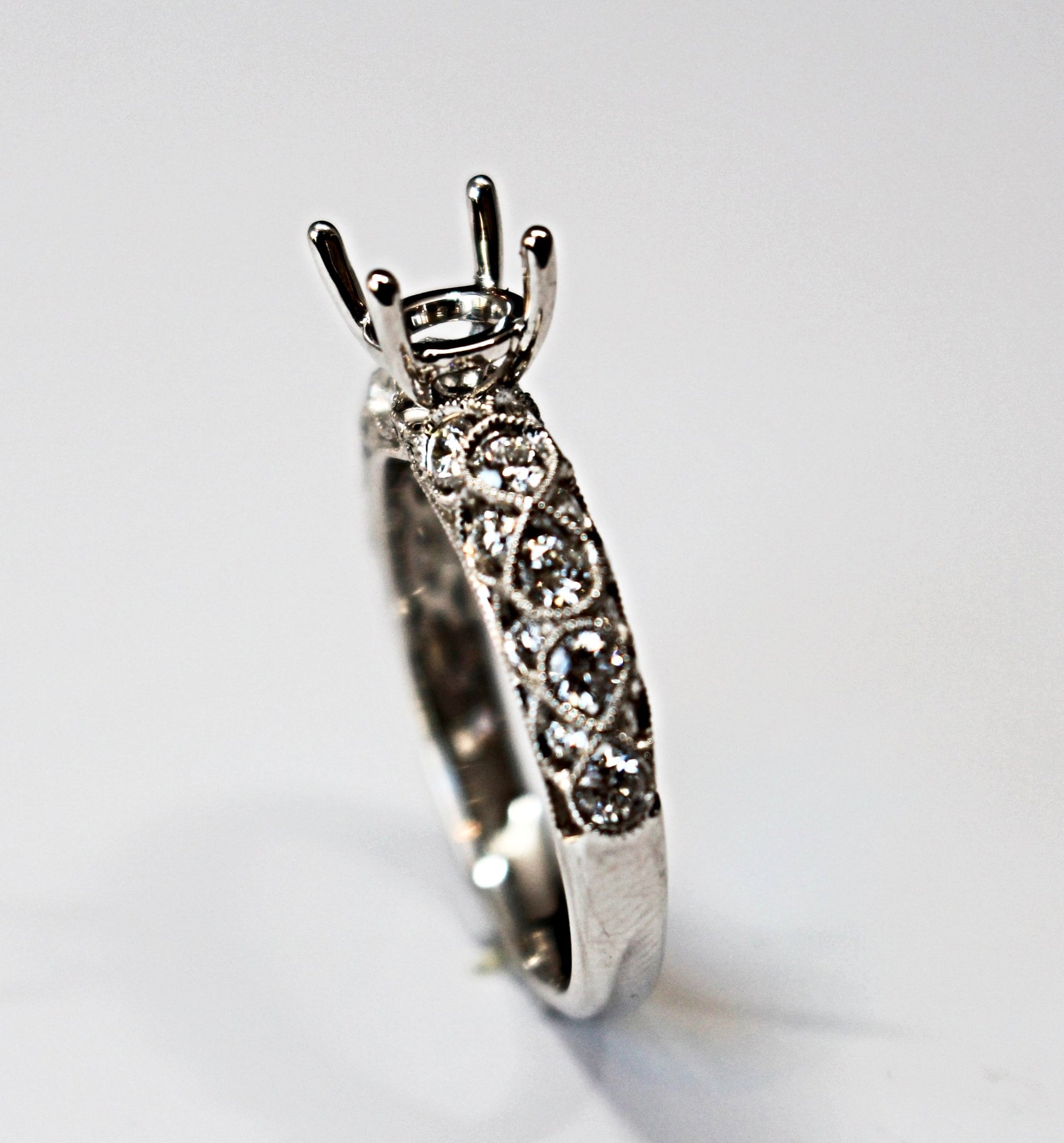 This high detail engagement ring is domed shaped and has diamonds on all angles. Every section of this ring has been accounted for with diamonds and design. Mil-grain has been added for enhanced vintage appeal. This setting can fit a .75ct-3ct center round shaped stone.