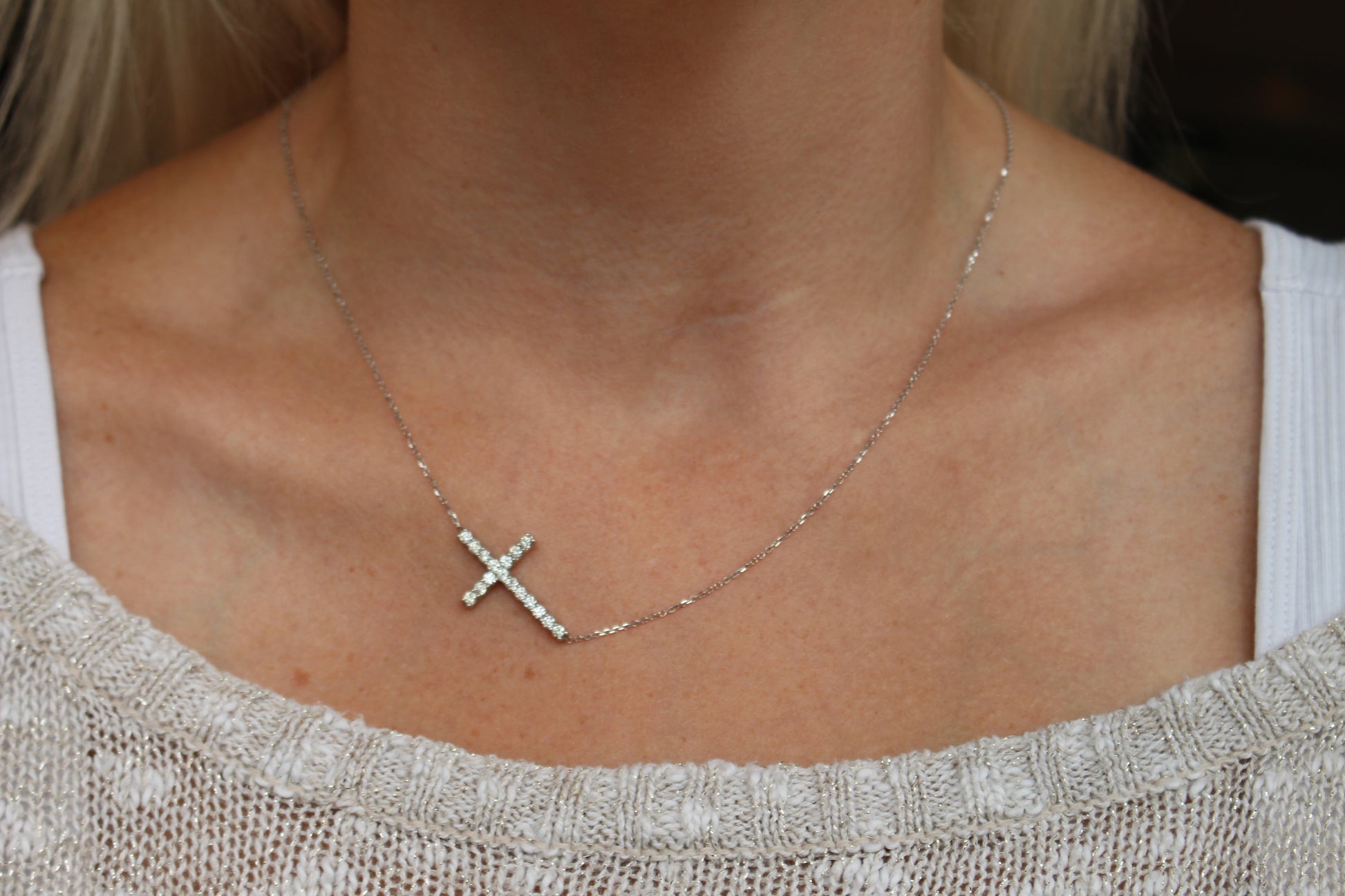 This sideways diamond cross pendant has 17 Round Brilliant Cut Diamonds Shared Prong Set for a total of 0.68cts. It measures 27mm in length and 17mm in Width. The cross is attached to the chain on the top and bottom.
