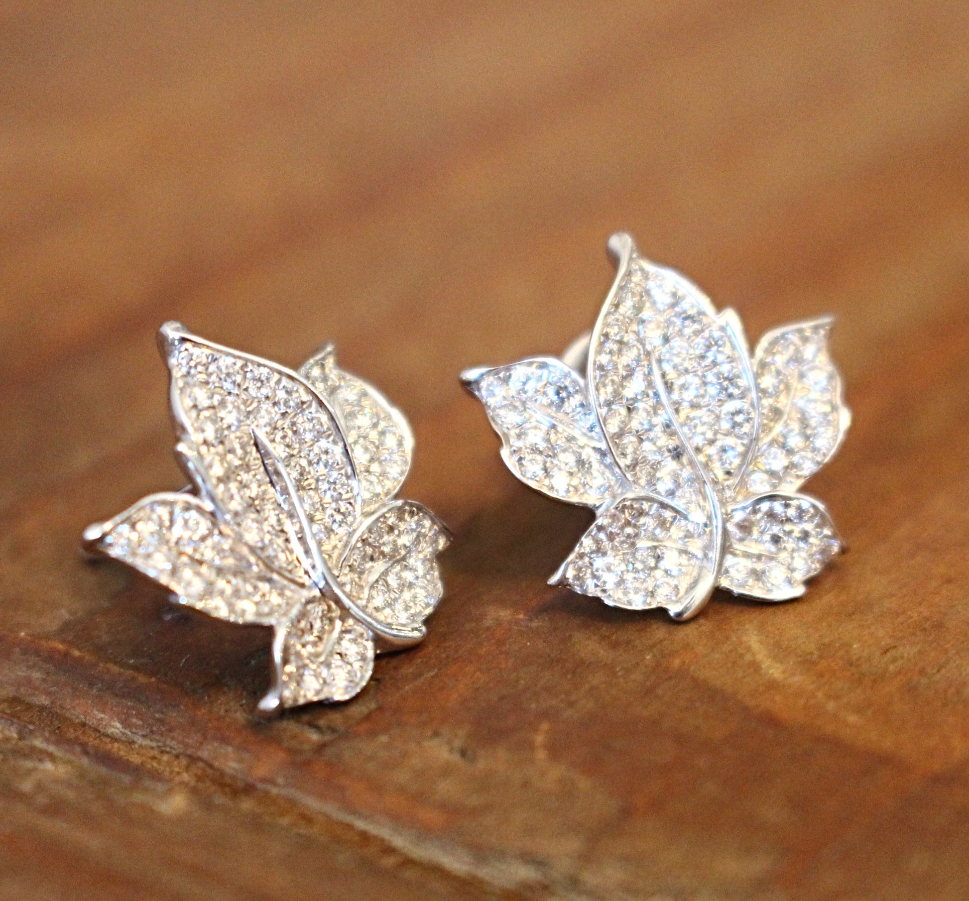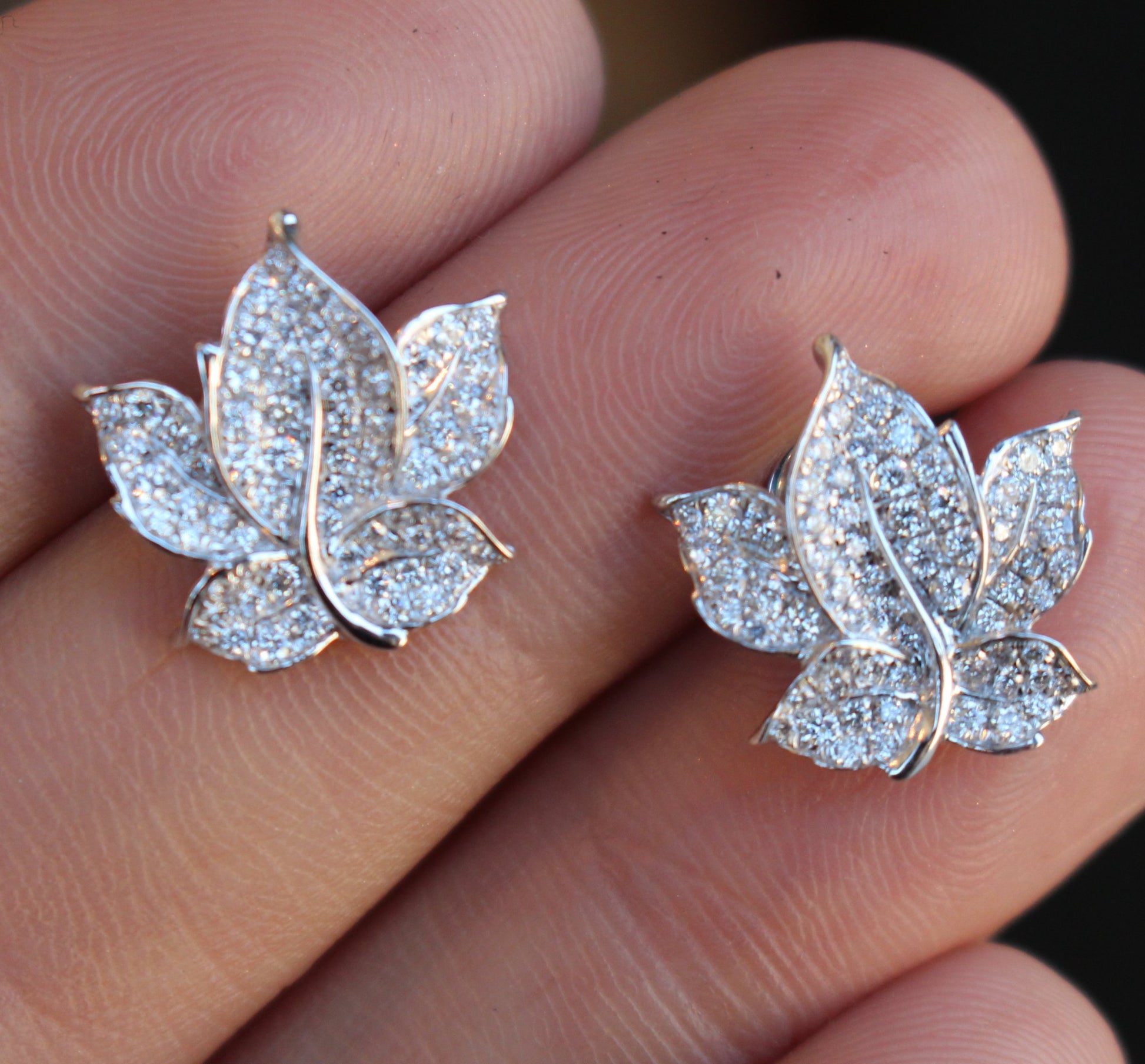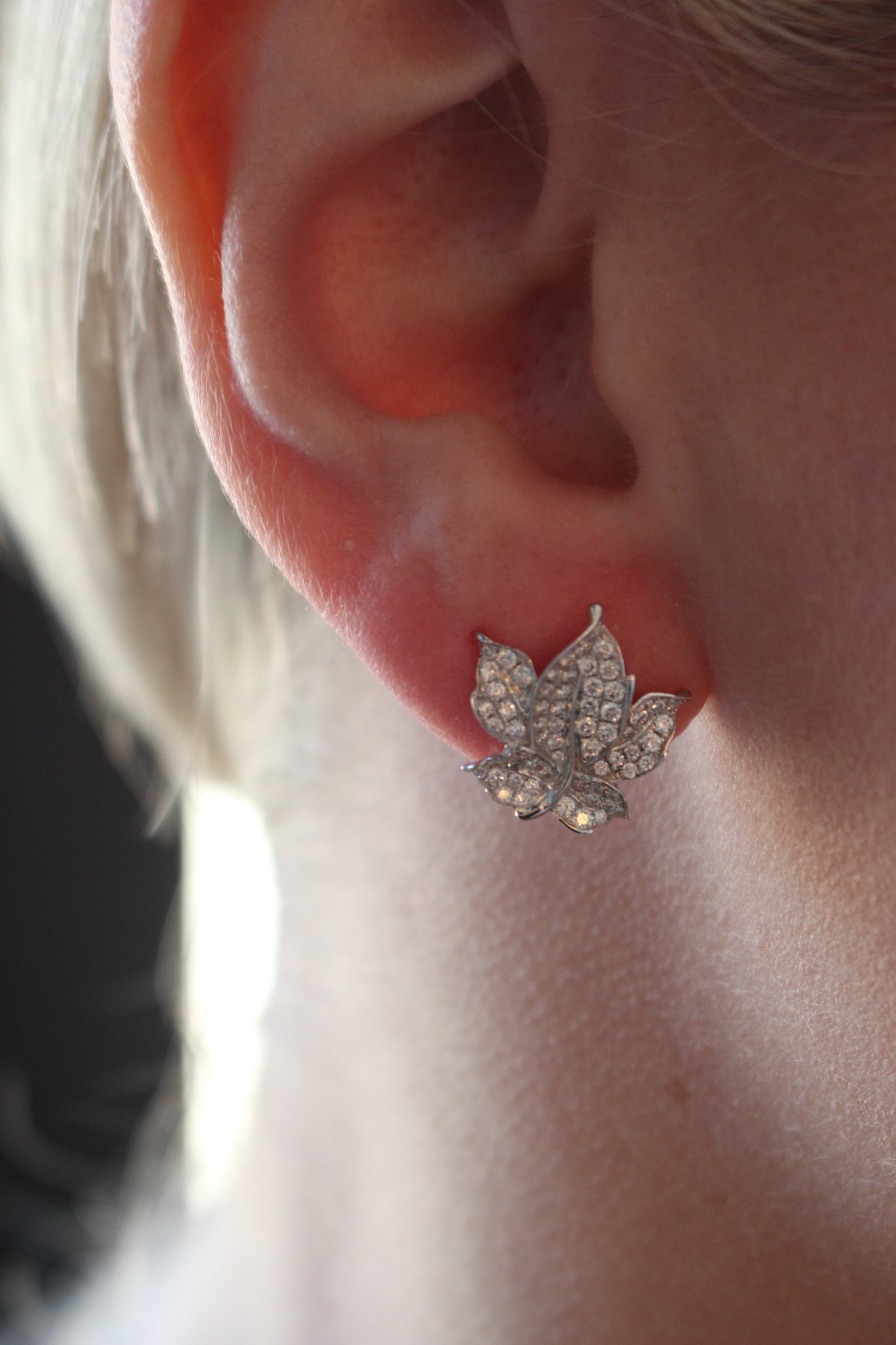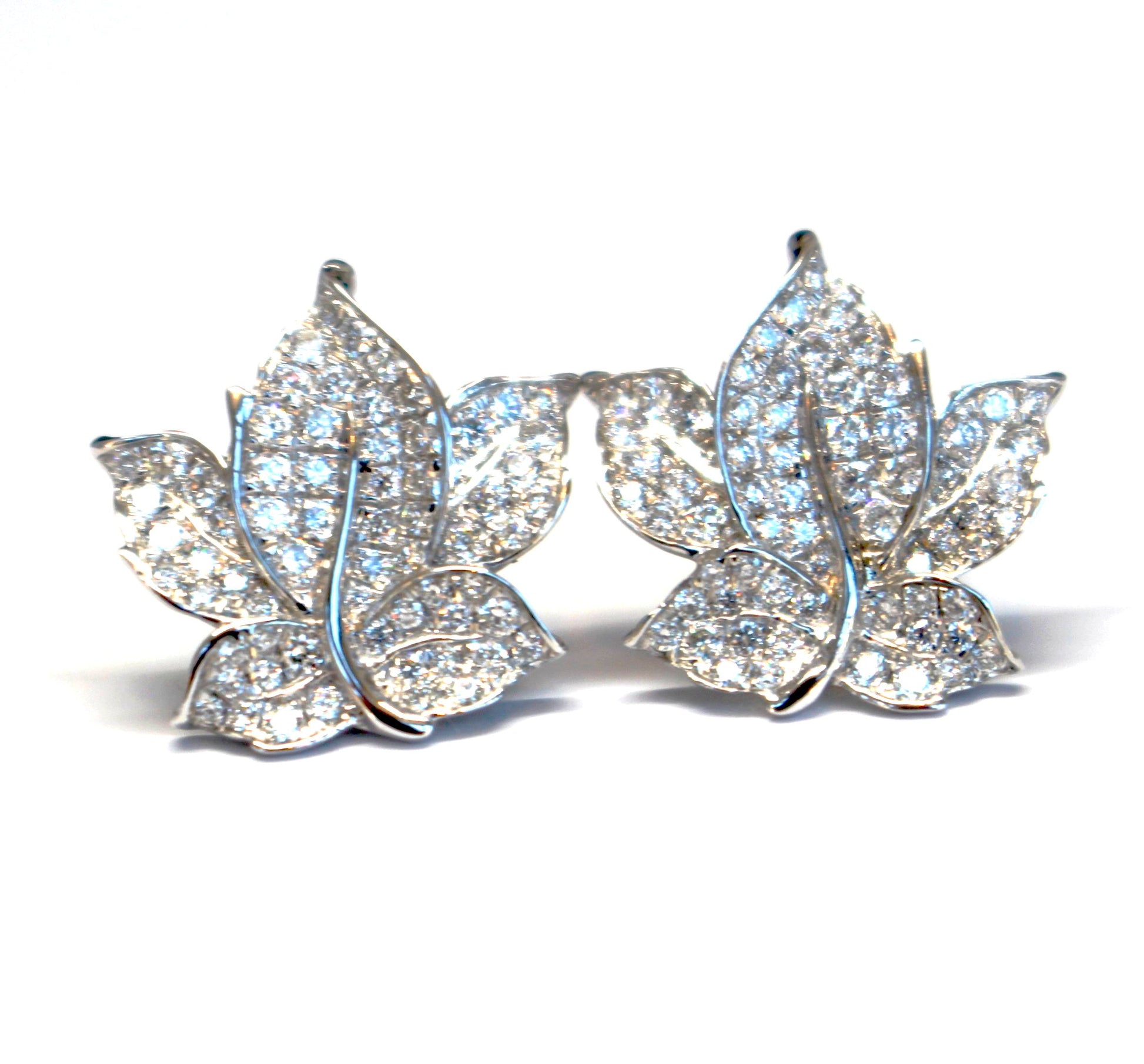 These earrings have 130 round brilliant cut diamonds that form pave set that form a leaf that sits beautifully on the ear. The total carat weight is only .82cts and the backs are friction/butterfly backs also in 18kt white gold. Currently, these earrings are SOLD OUT and will take 10 days to make if ordered. If you would like it in another metal, please call/text us at (630)355-7464 for availability time frame.