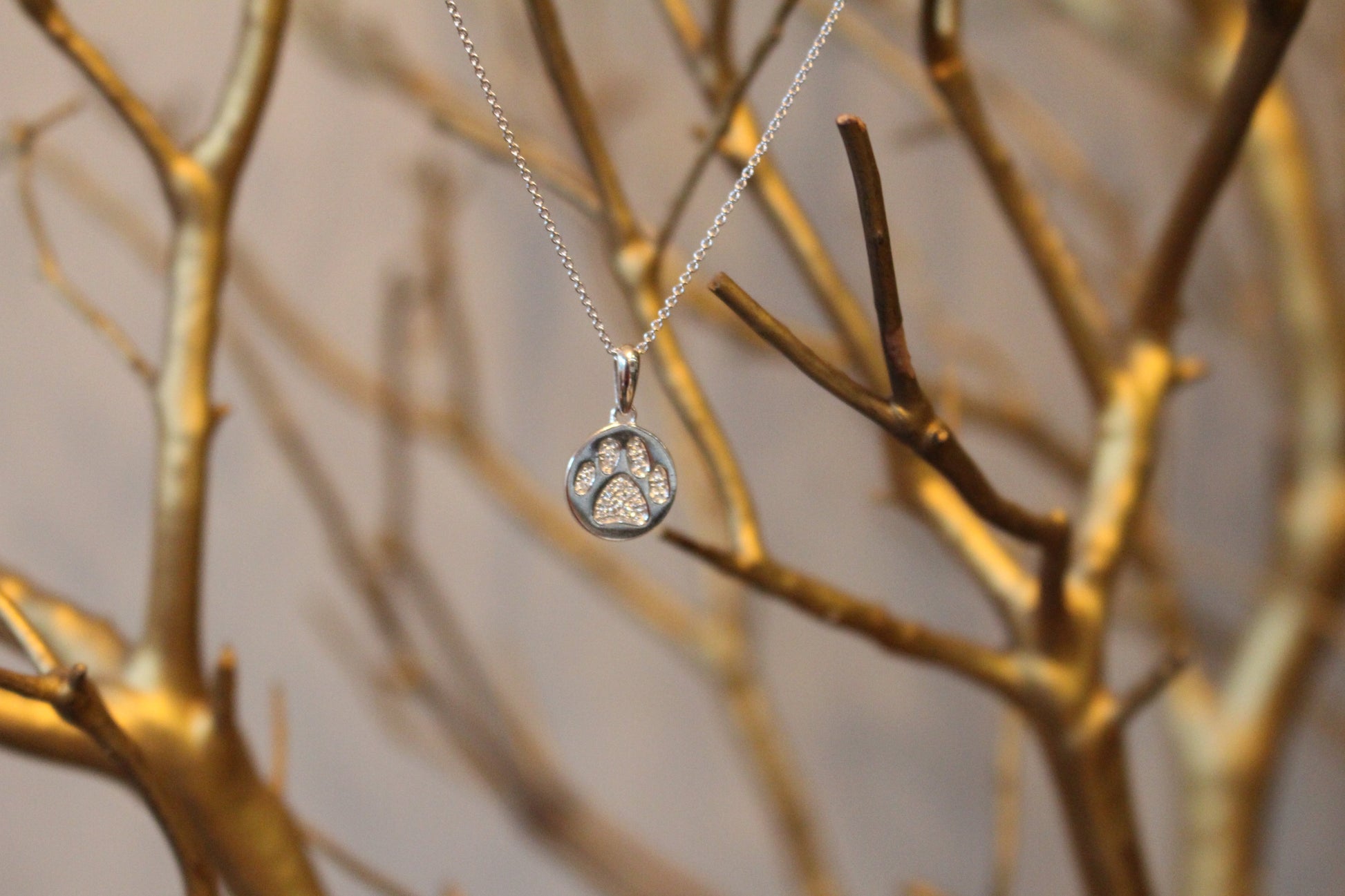 Cute and fun, this diamond disc pave paw pendant is perfect for any dog lover! It's a paw made with 18 Round Brilliant Cut Diamonds Pave set in a 14kt Yellow Gold, Rose, or White Gold Disc. All metal types take 5 days to make.