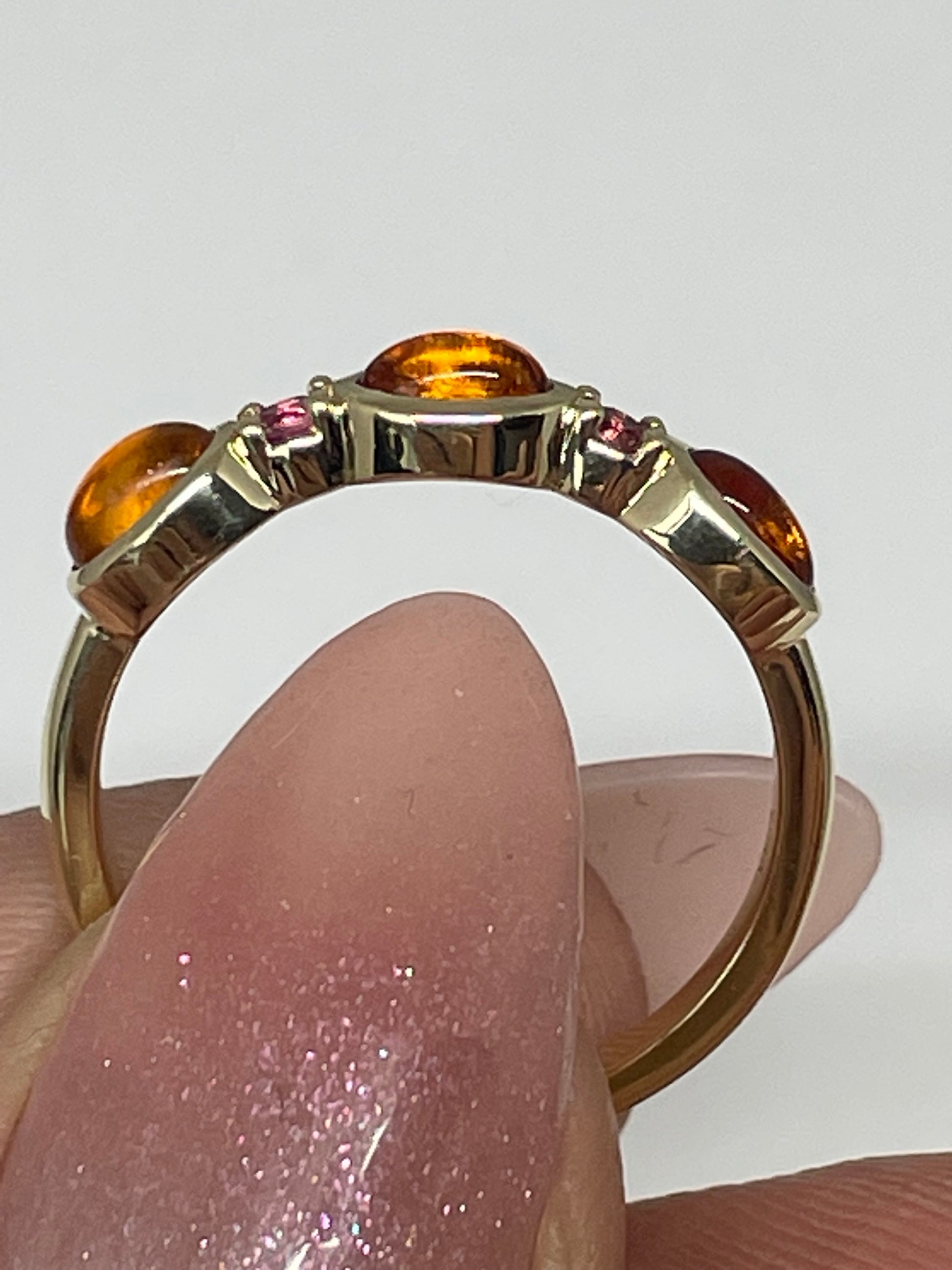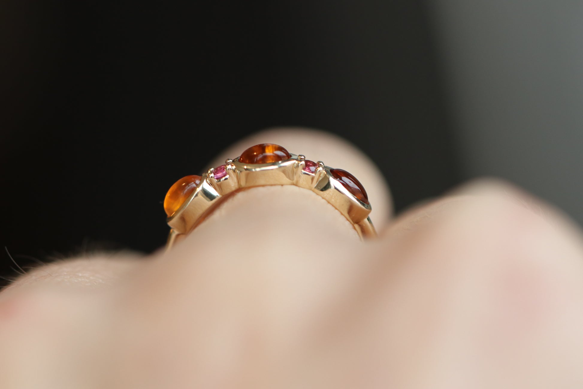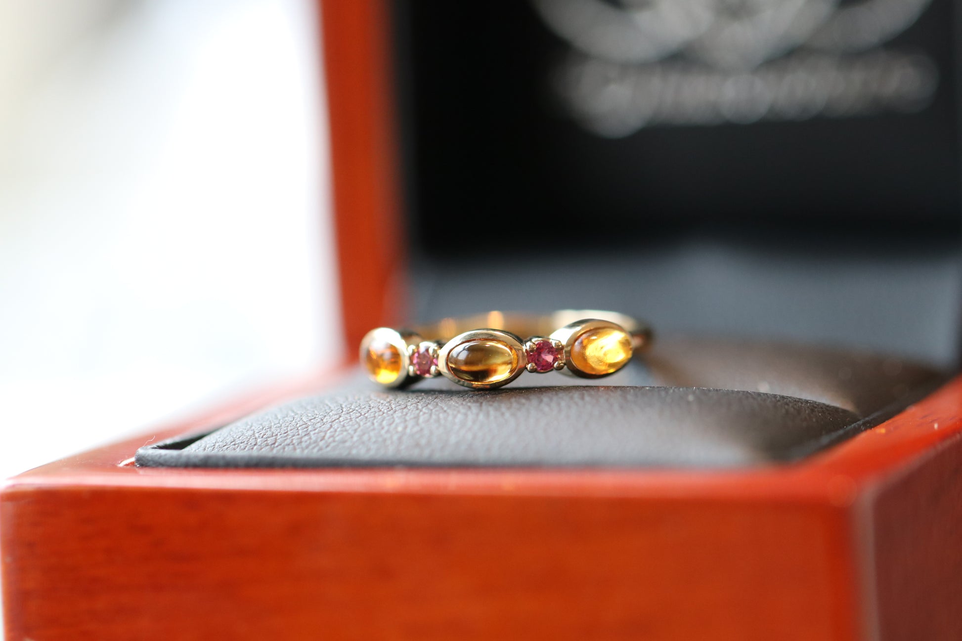 This stunning ring showcases alternating Oval Cut Citirne Cabochons with round facet cut pink tourmalines all bezel set for a smooth clean look. Citirne also happends to be the Birthstone for the month of November.