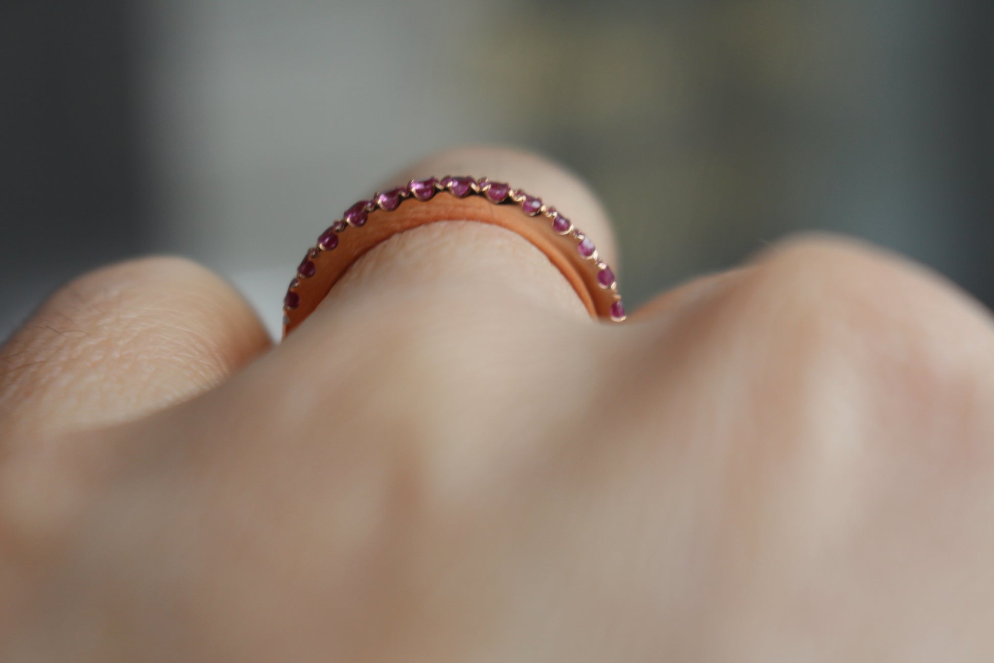 This 14kt rose gold band has 14 round cut pink tourmalines shared prong set that equal 0.70cts. The band is about 3mm wide and 2.5mm in height. Can be worn as a wedding band or stackable. This band takes 3 days to make. Please call/text (630)355-RING(7464) for a quote and time frame with a different metal or gemstone.