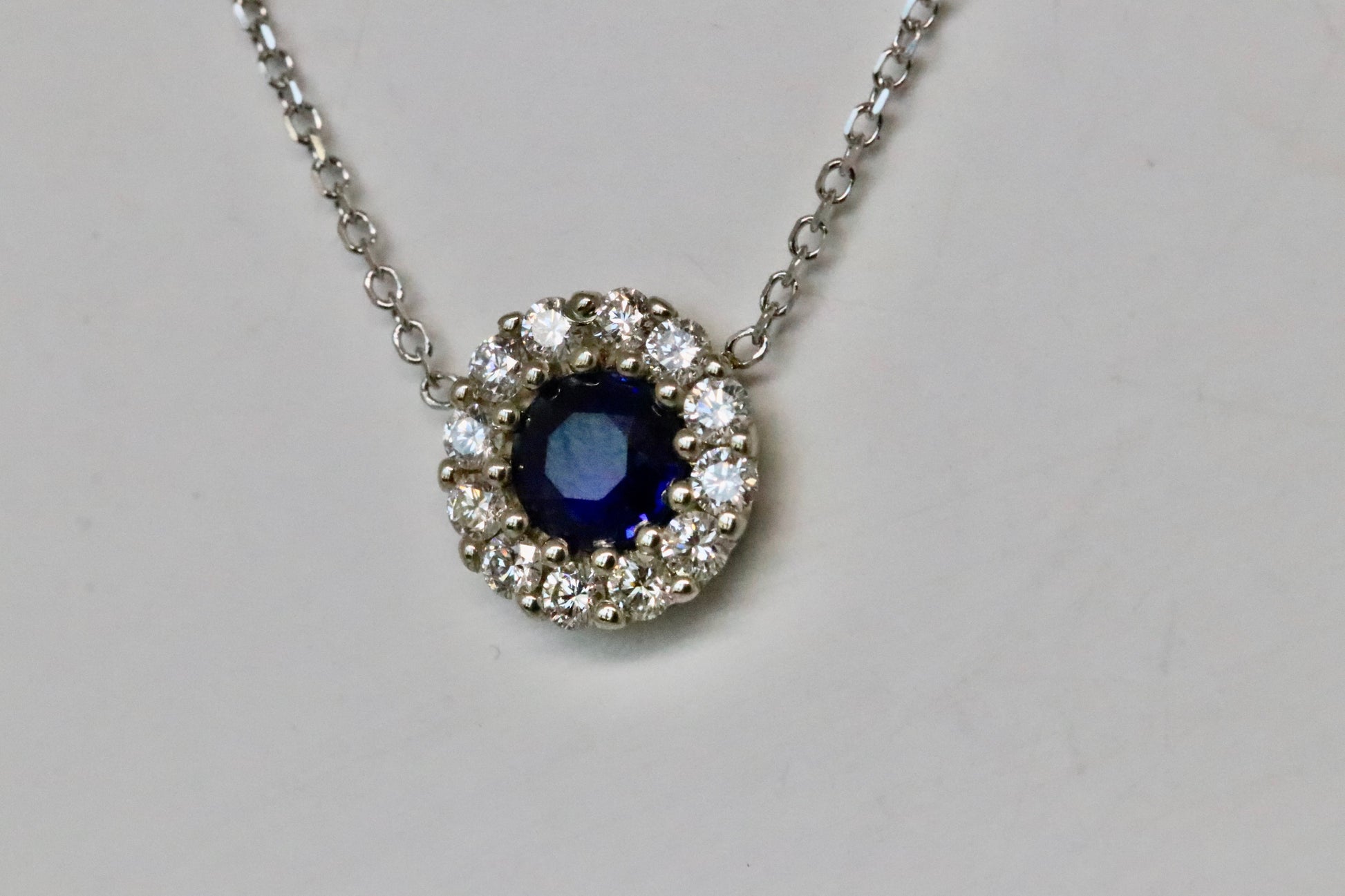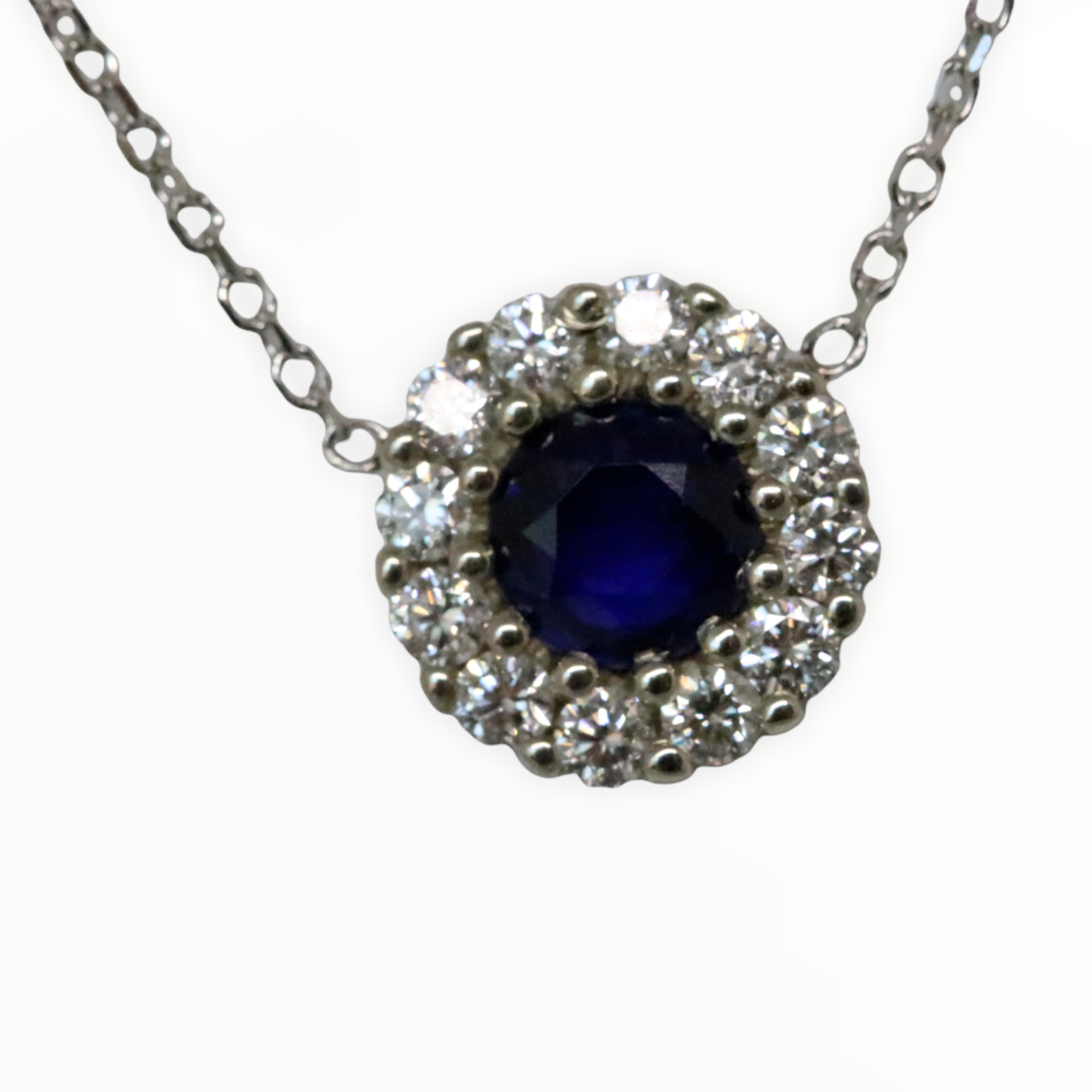 Round Blue Sapphire Diamond Halo Pendant in 14kt White Gold