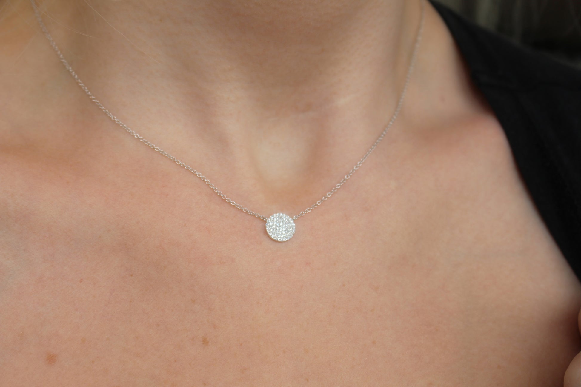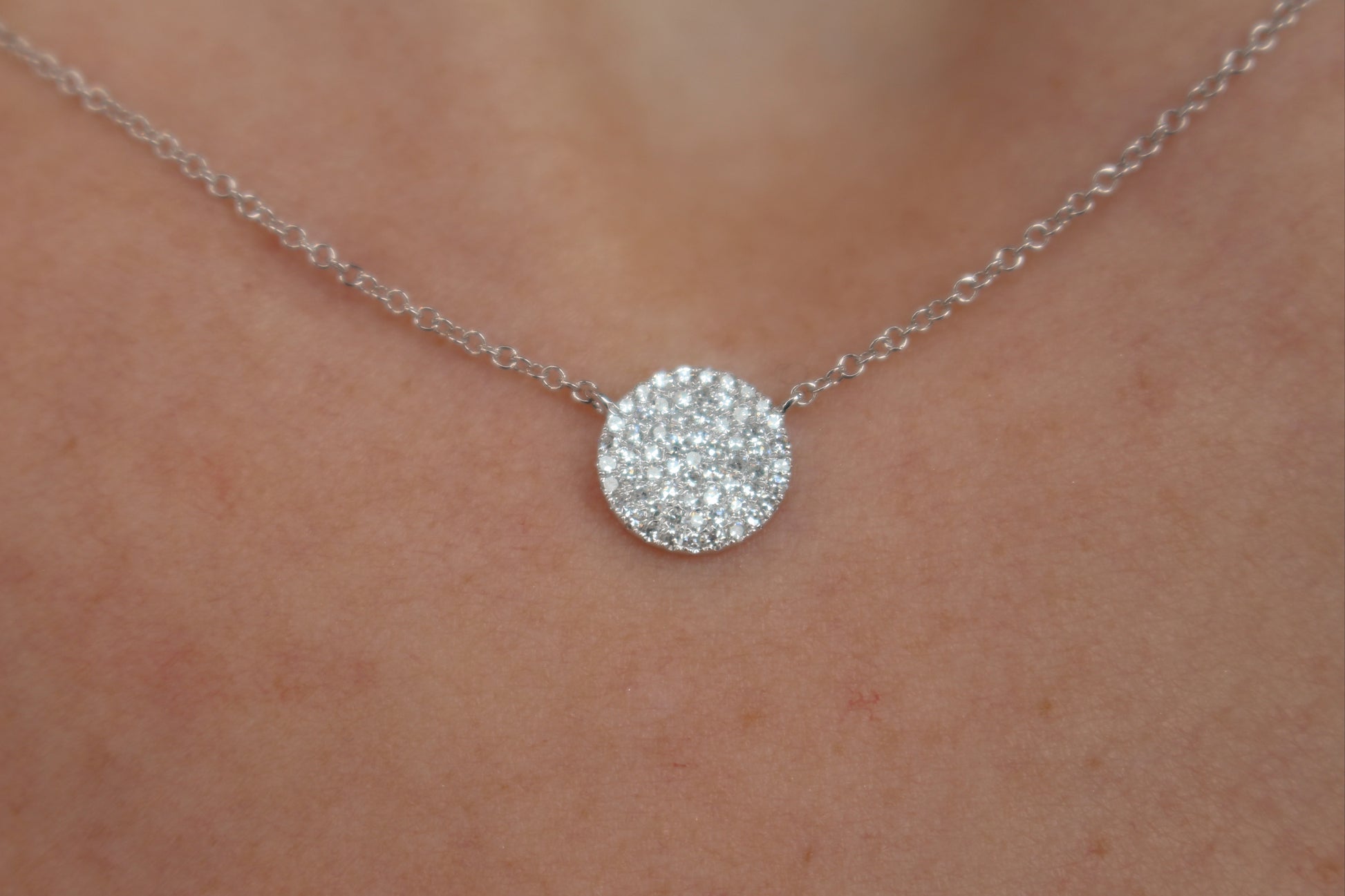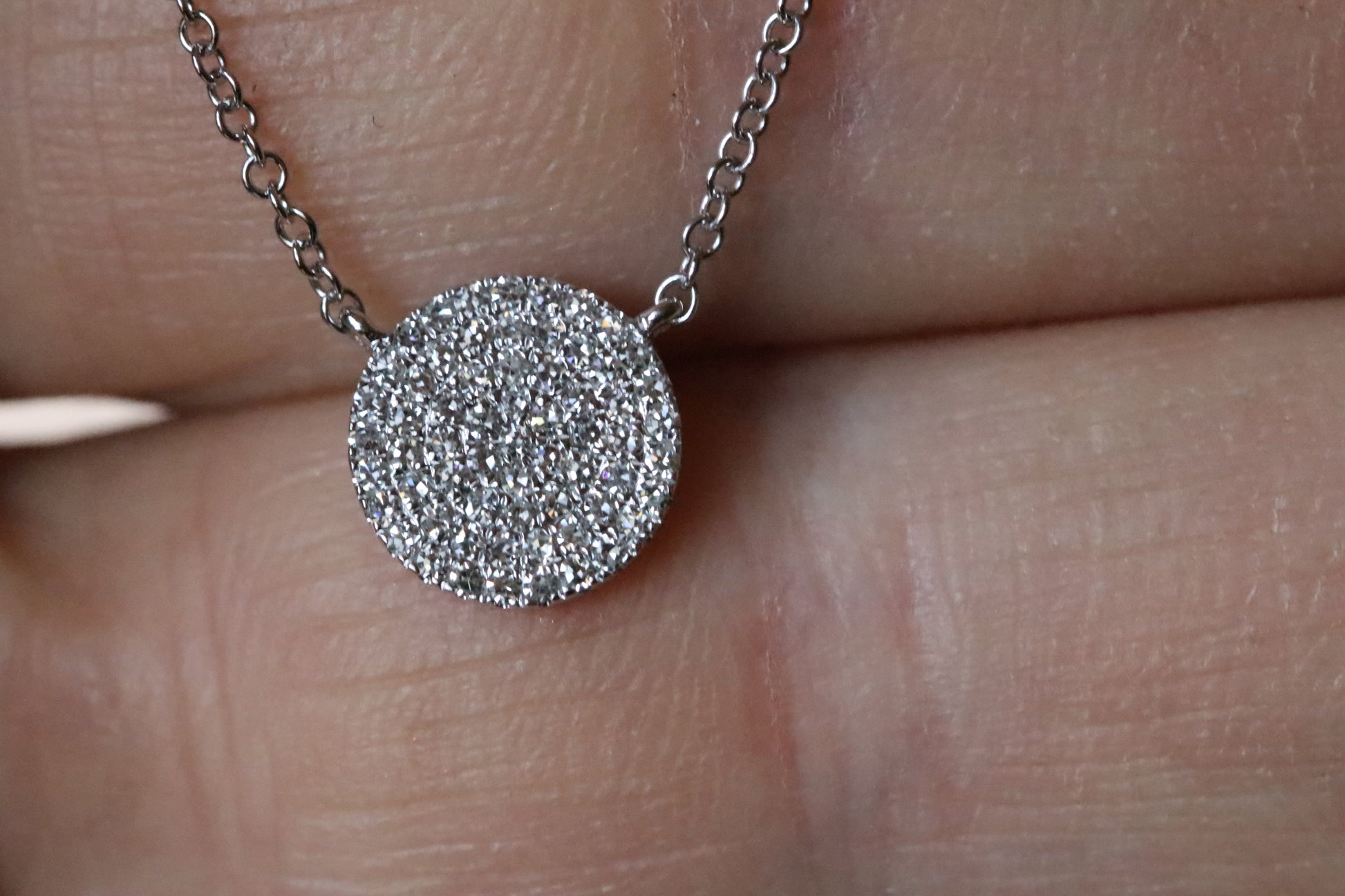 This diamond disc pendant has POP and sparkles like crazy. There are 63 round brilliant cut diamonds pave set in a disc that is 9mm in size. This pendant hangs from an adjustable cable chain. Currently, this pendant is featured in 14kt white gold but it also comes in 14kt yellow and rose gold. It takes 10 days to make in all three metals. Call/text at (630)355-RING with questions.
