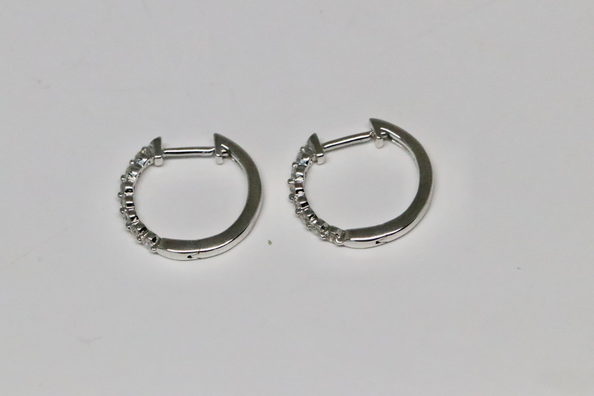 Each diamond is shared prong set. The measurement of each hinged hoop earring is 15.25mm and these are available for next-day delivery in 14kt white gold but if you would like in another metal, please give us 7 days. If you would like these in another set of gemstones or different carat weight, please call/text us at (630)355-7464 for the availability time frame.