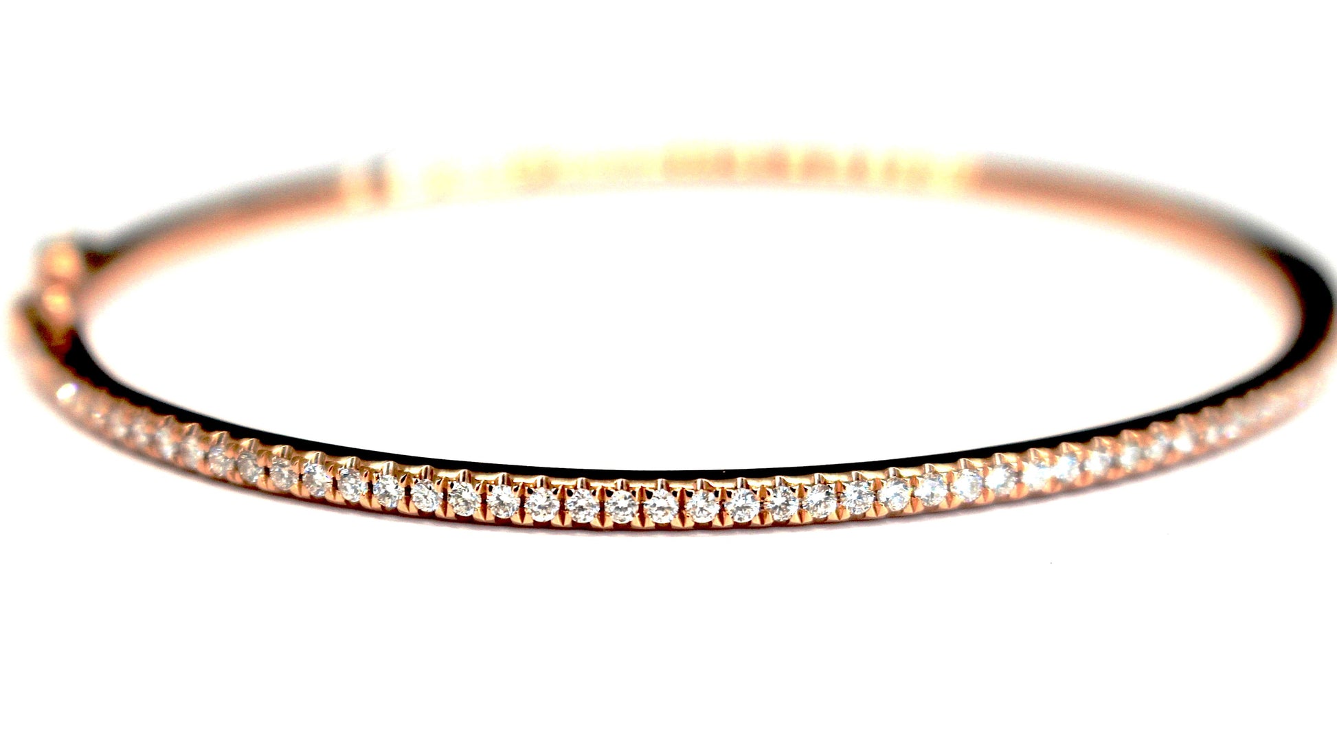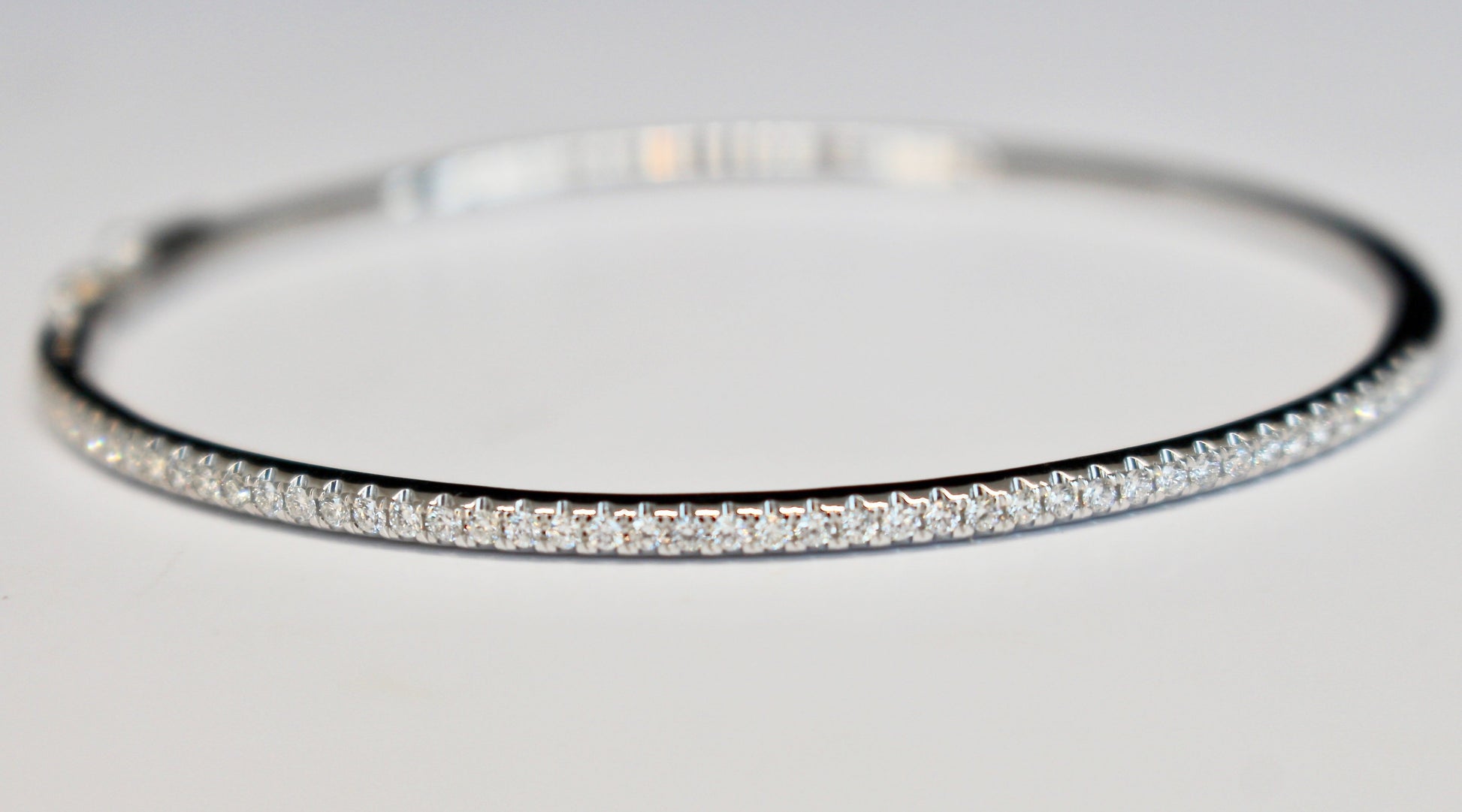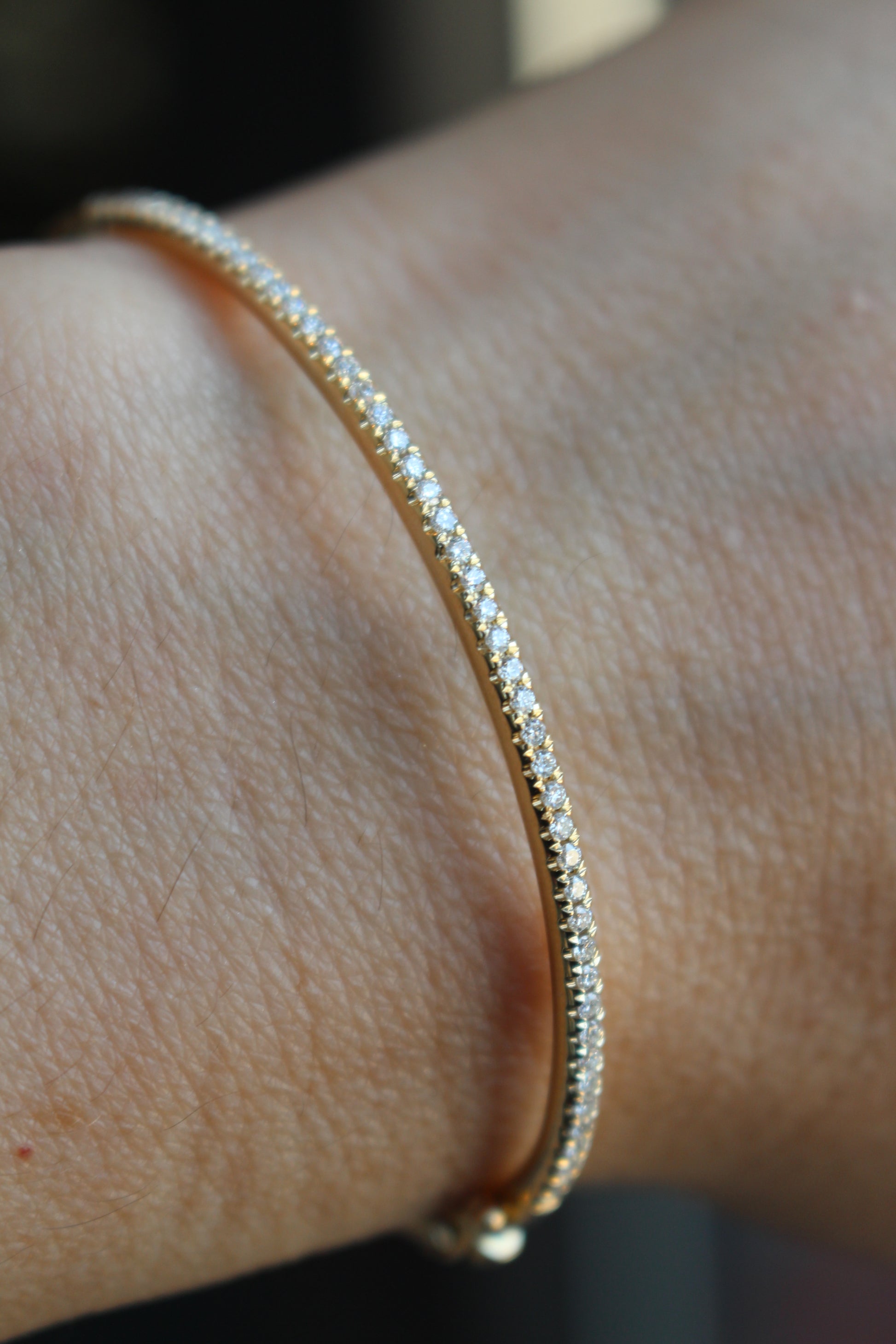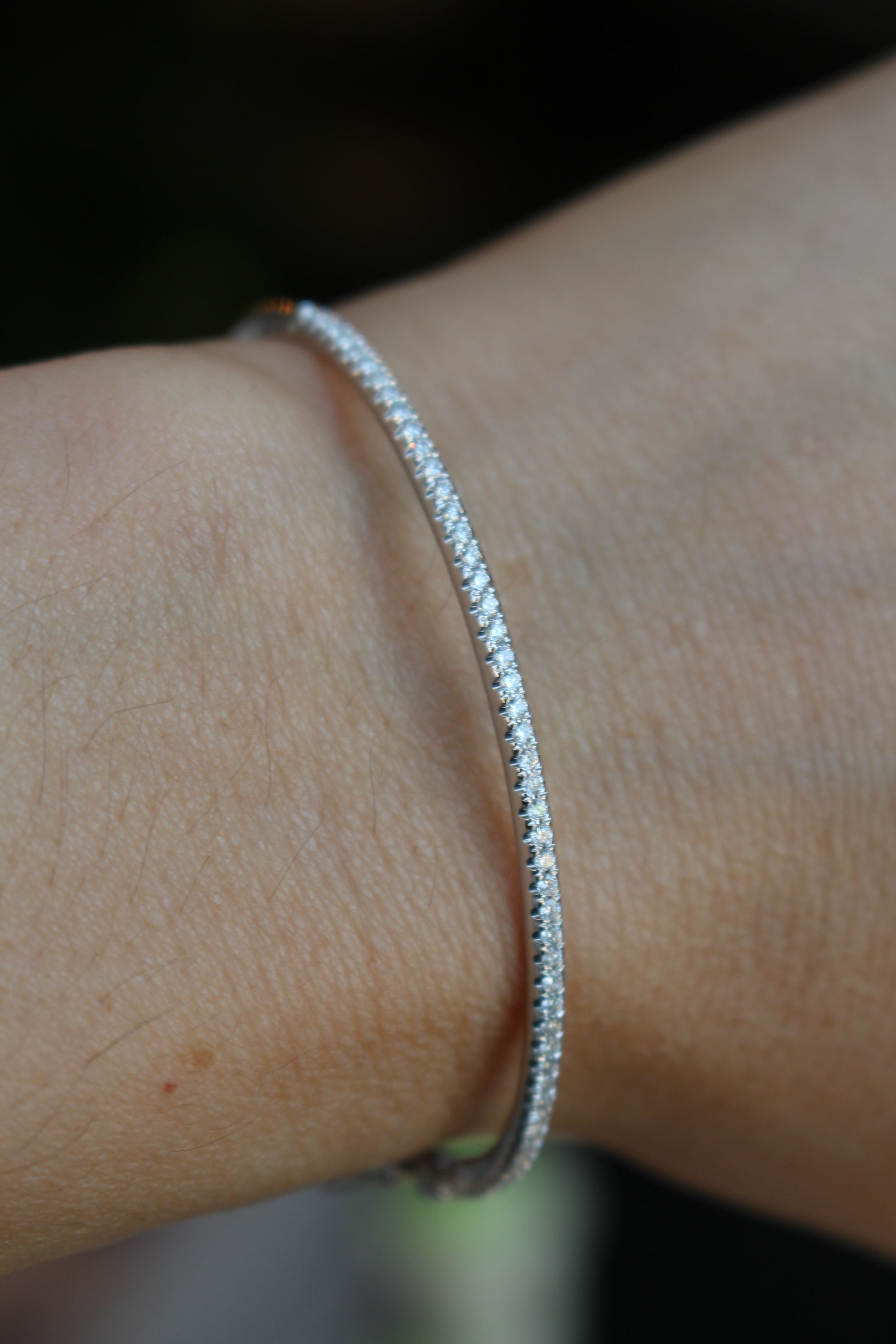 This is a Diamondaire Exclusive Bangle made with 47 Round Brilliant cut diamonds french scalloped set with a double safety clasp. We made it an oblong shape and 2.2mm in width to give the most sparkle, yet sit fit comfortably on the wrist. The model in the picture has a 6.5-inch wrist. Will sit comfortably on 6-7.5inch wrists.