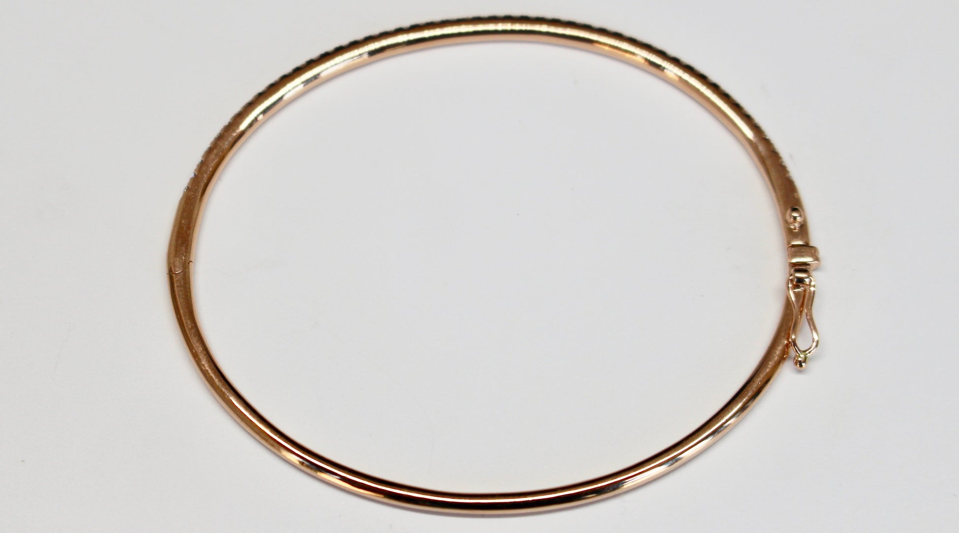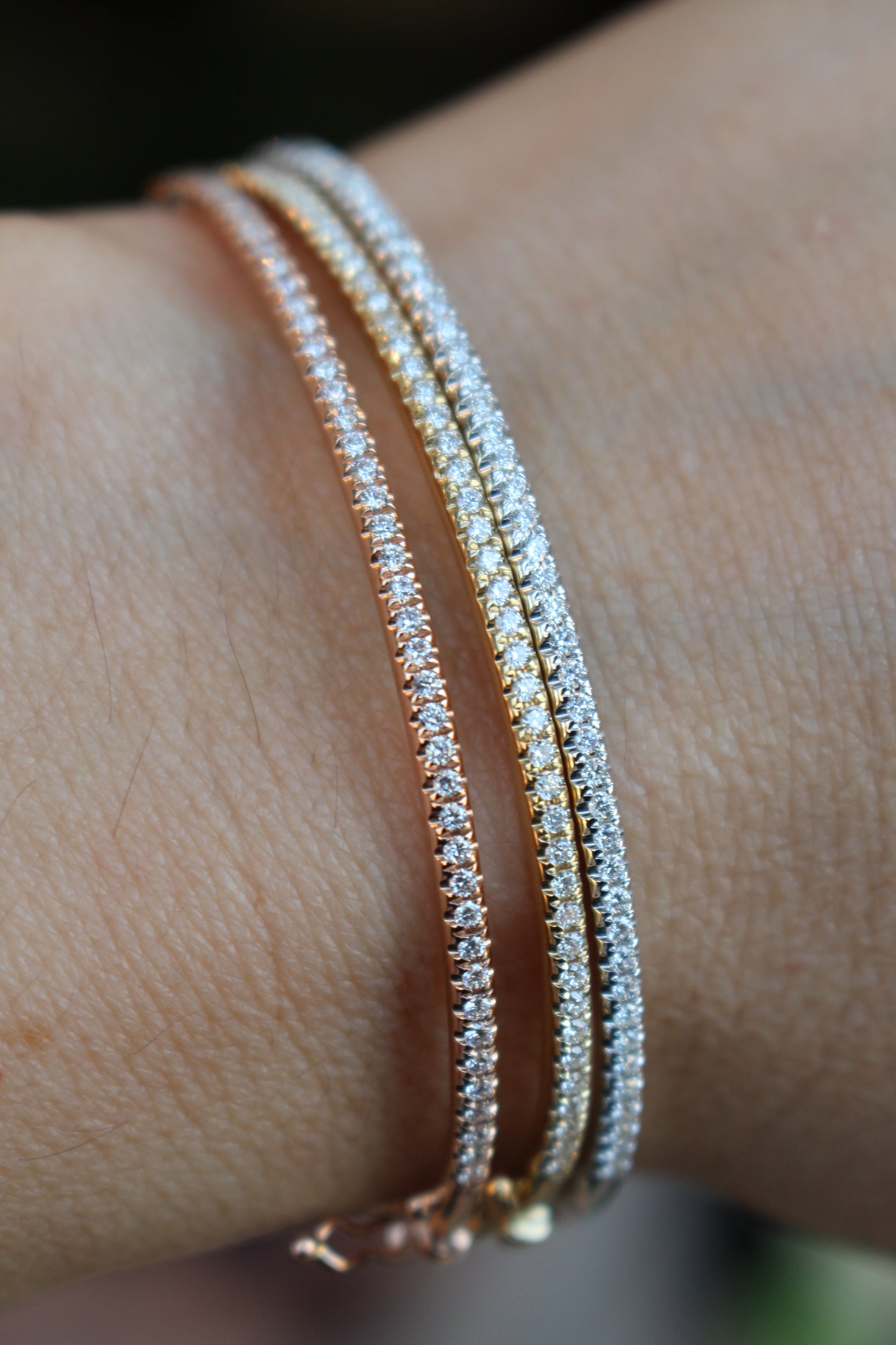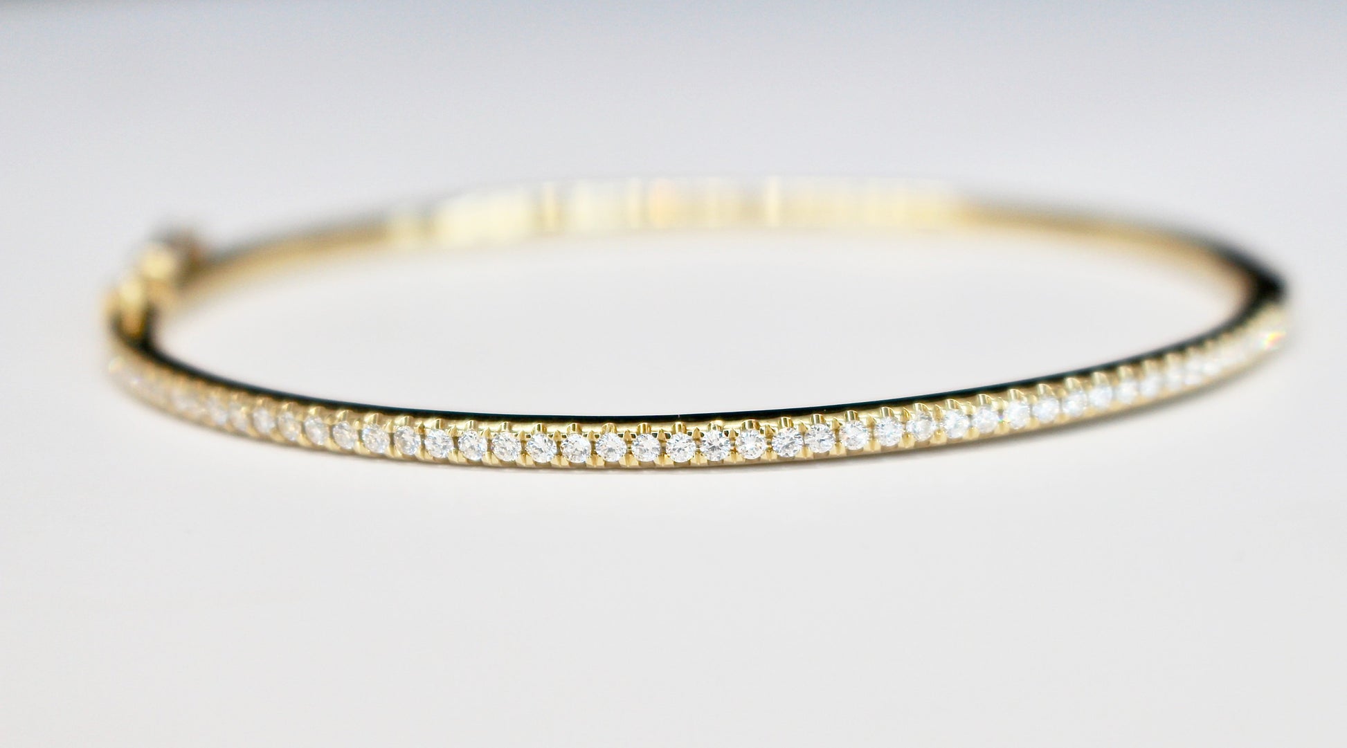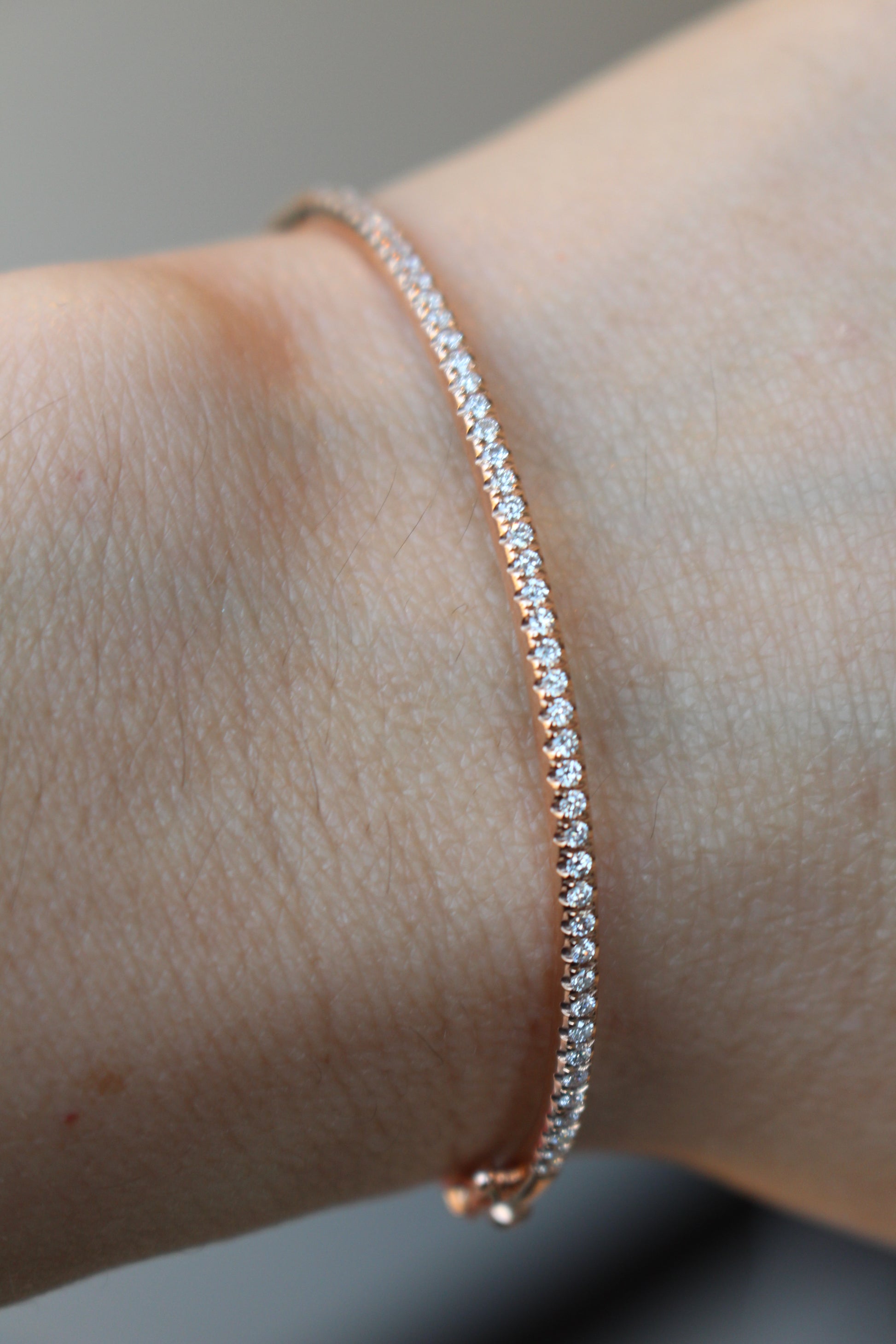 This is a Diamondaire Exclusive Bangle made with 47 Round Brilliant cut diamonds french scalloped set with a double safety clasp. We made it an oblong shape and 2.2mm in width to give the most sparkle, yet sit fit comfortably on the wrist. The model in the picture has a 6.5-inch wrist. Will sit comfortably on 6-7.5inch wrists.