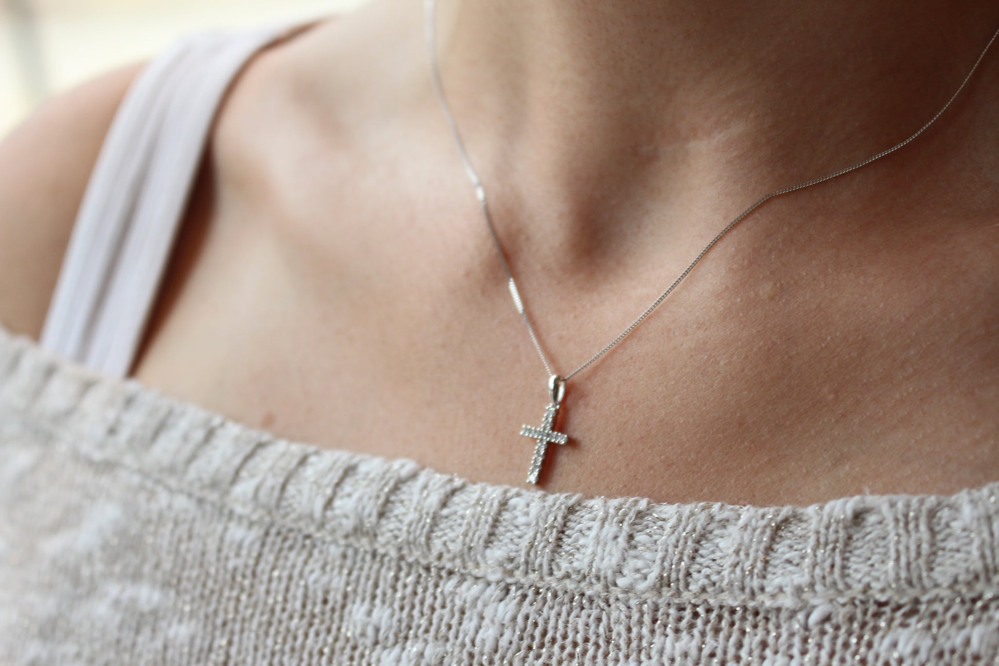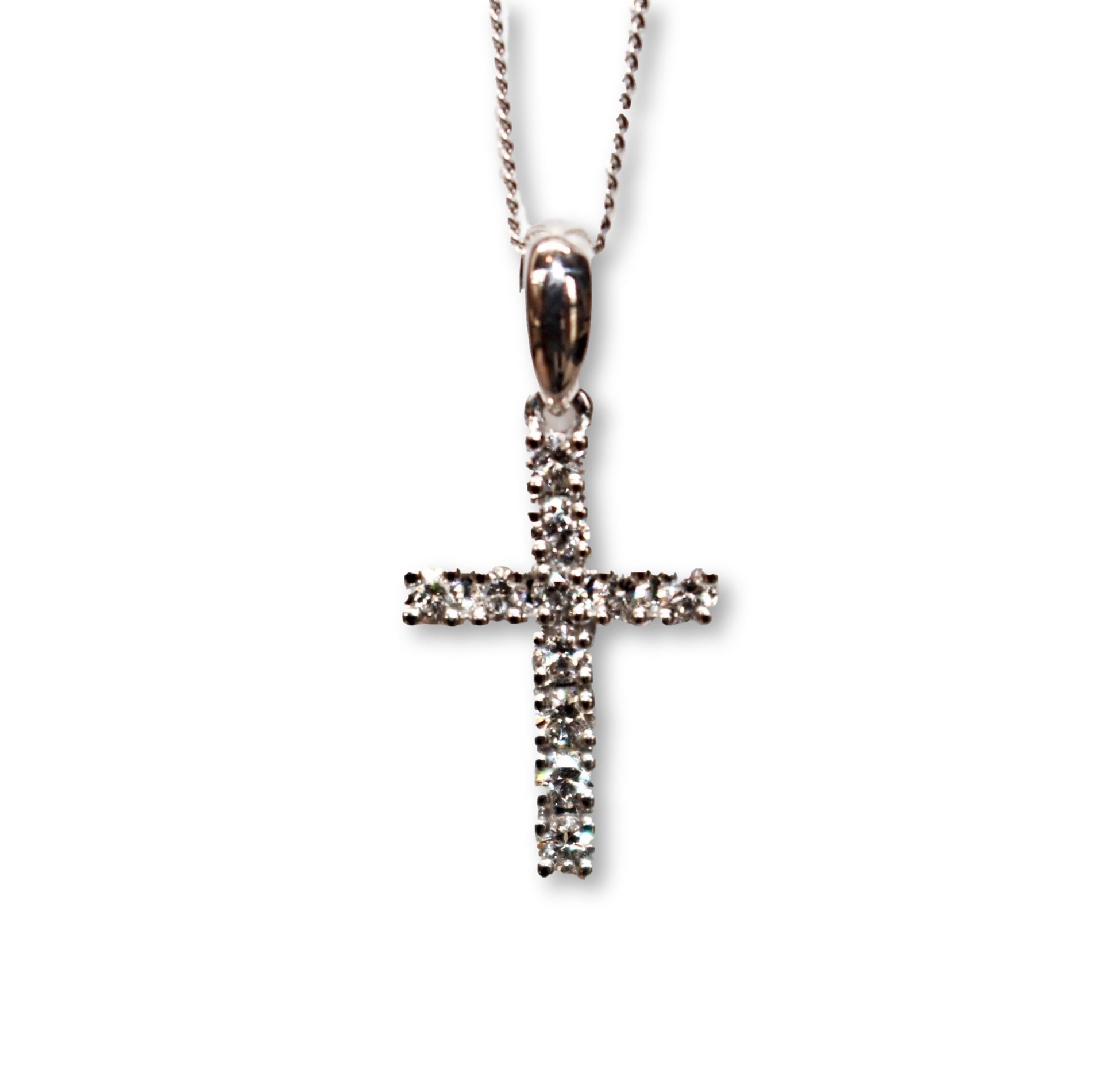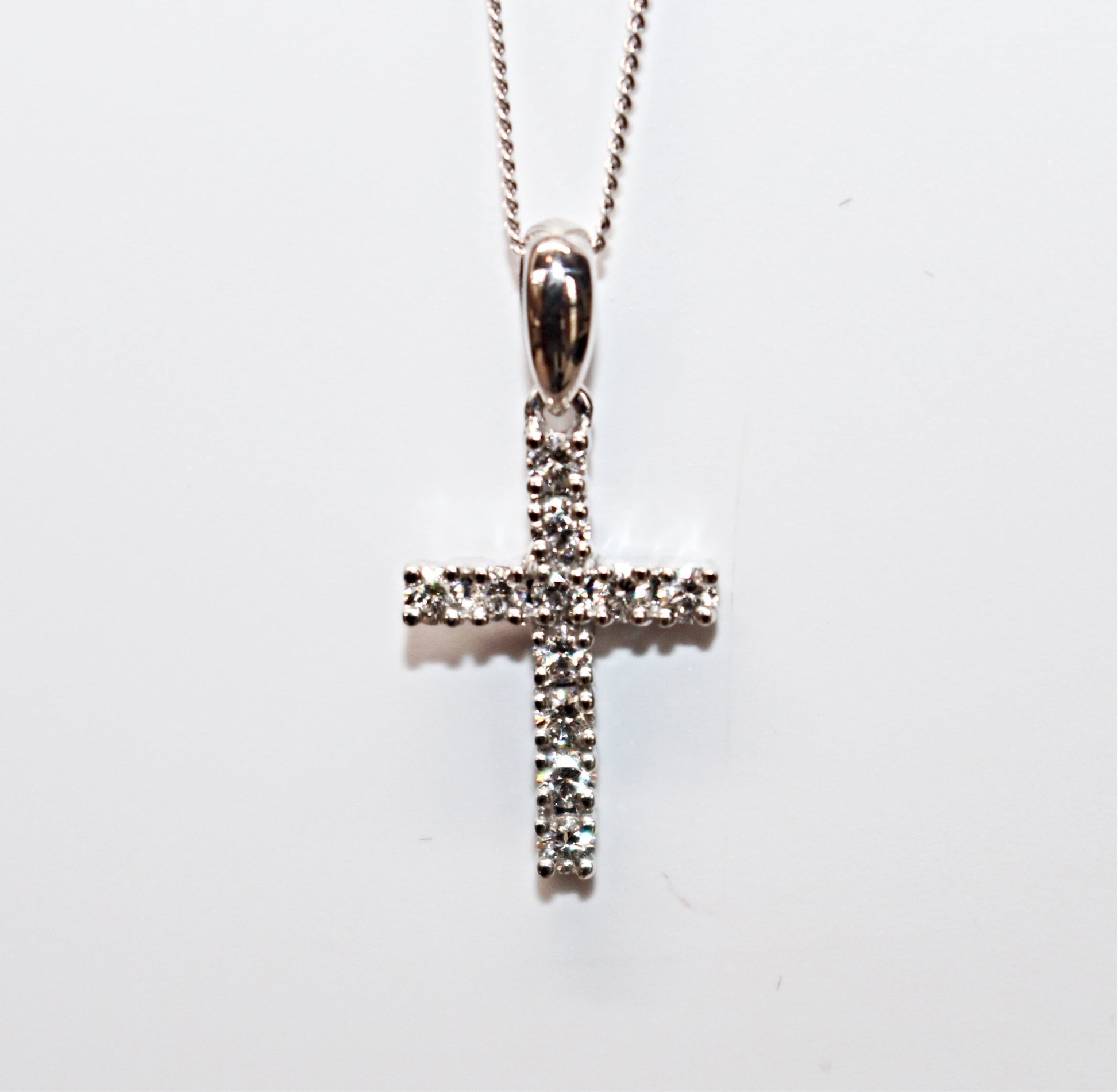 This small diamond cross pendant has 11 Round Brilliant Cut Diamonds Shared Prong Set for a total of 0.25cts. The chain easily fits through a bail on top of the cross.