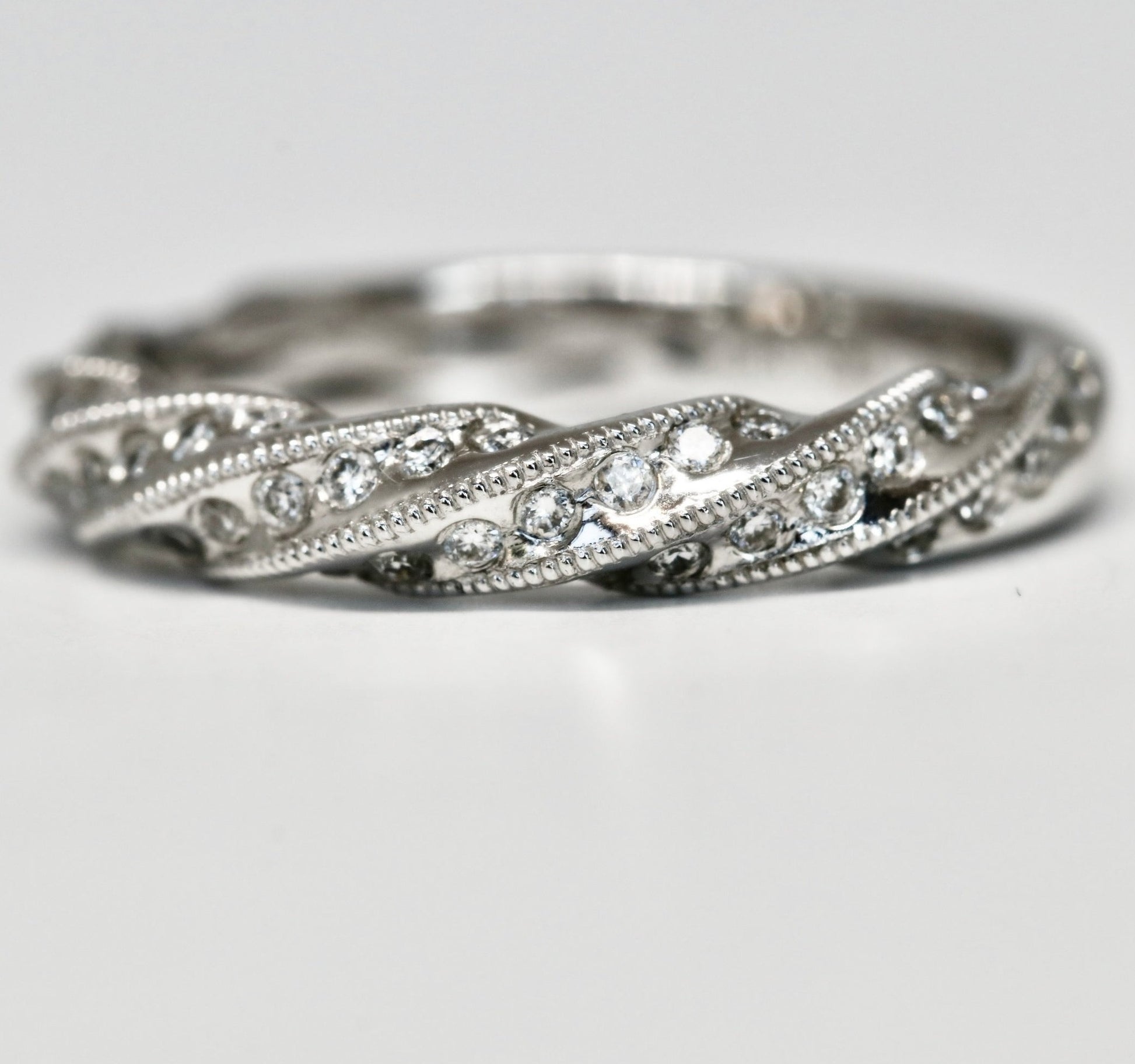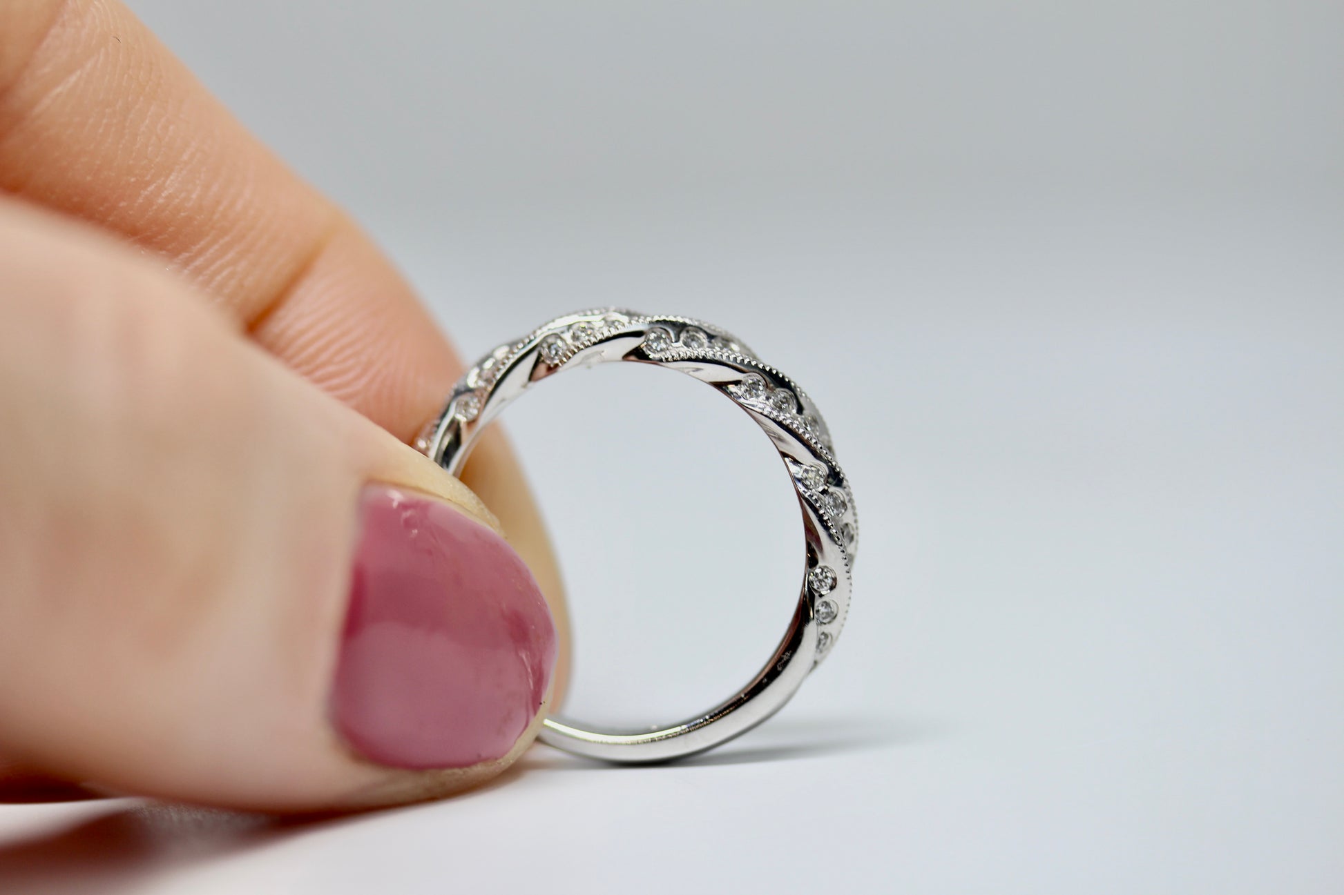Not only does this band have a twist but it also has 56 round brilliant cut diamonds channel set with a mil-grain outline. This means it is perfect for the lady who does not want prongs, edges, or corners on her ring. It's very comfortable on, as well.