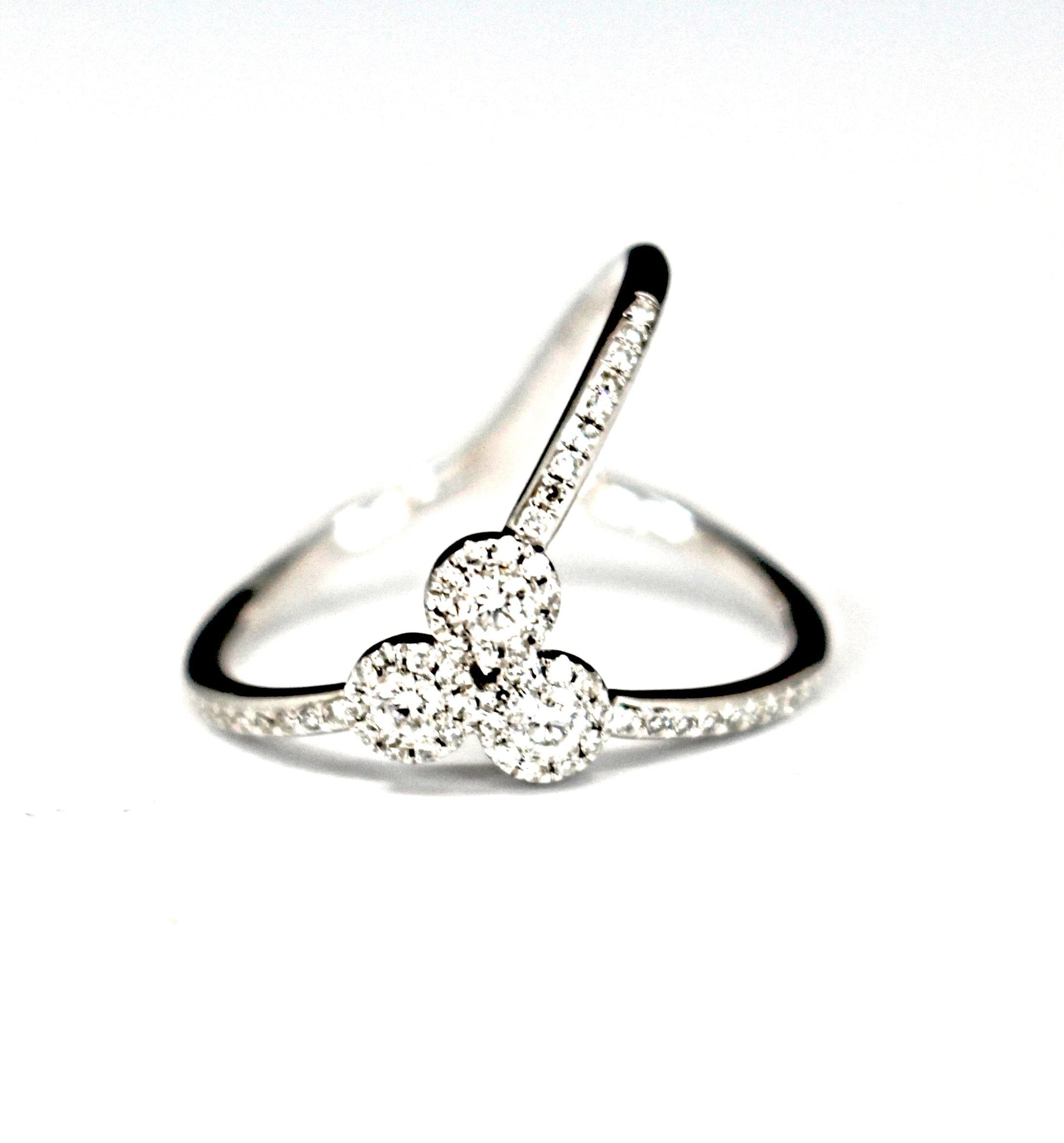 This ring is VERY unique. It features 3 round brilliant cut diamonds in the center, surrounded by 3 diamond halos, and 3 diamond shared prong rows going in different directions. As you can see in the pictures it lays nicely on the hand is a new take on a 3 stone ring AKA, past, present, and future.