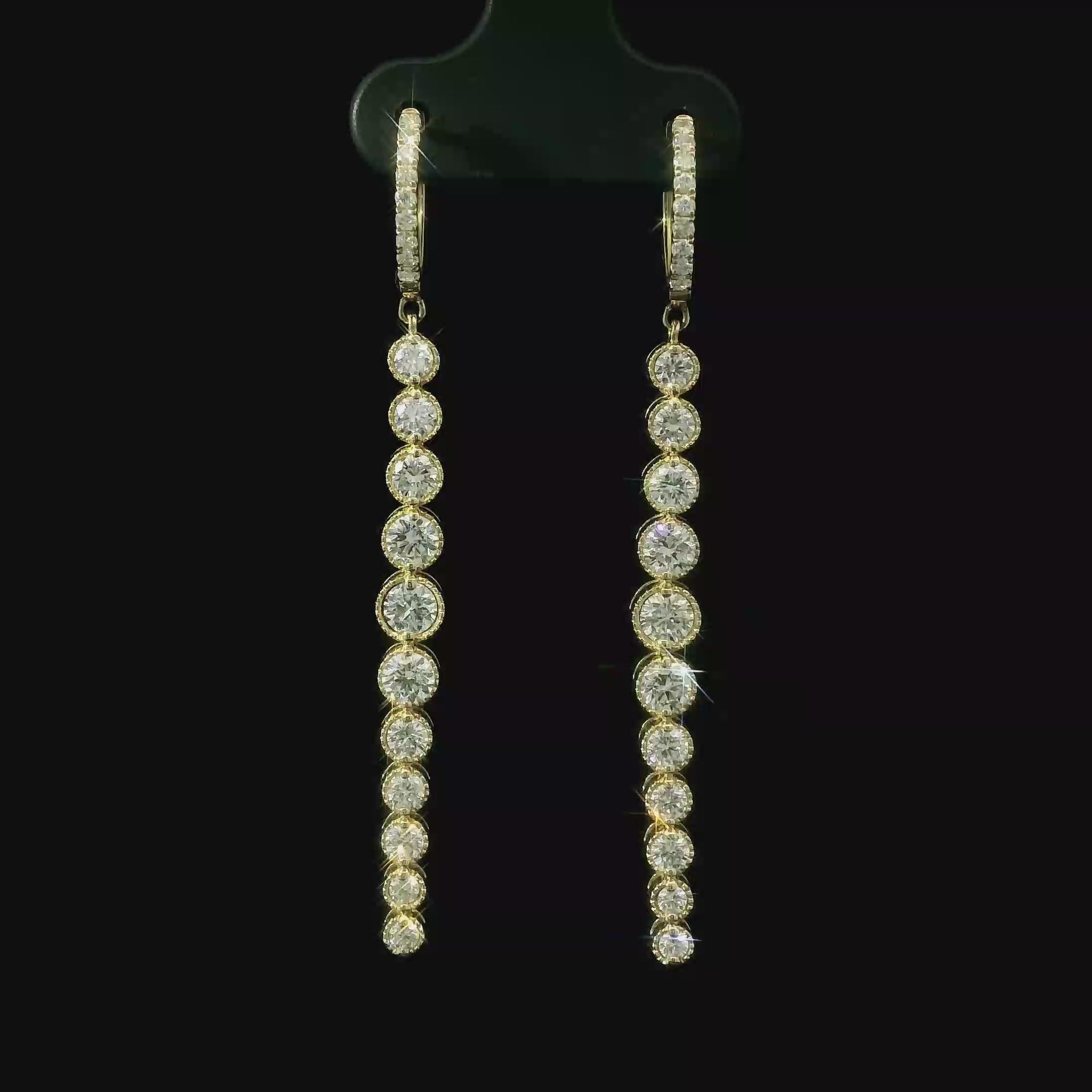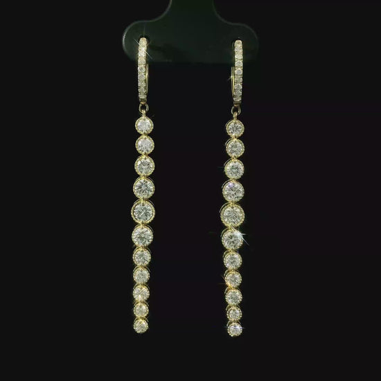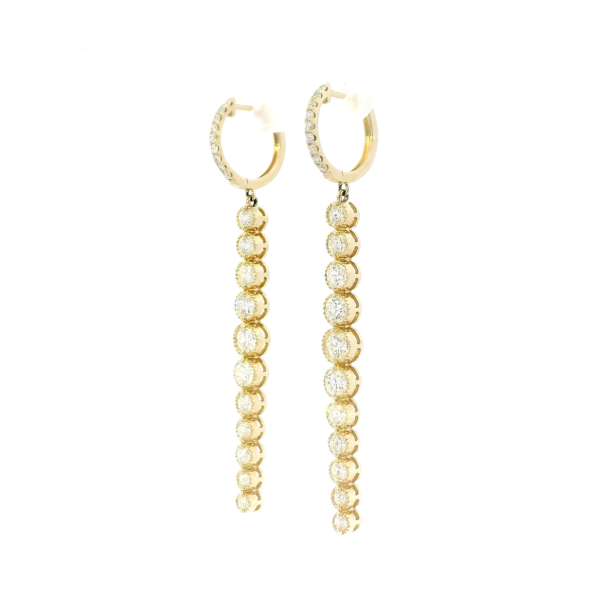 Elevate your elegance with these breathtaking natural diamond drop earrings, crafted in warm 14K yellow gold. Designed with timeless sophistication, each earring features a graduated line of round brilliant cut diamonds, meticulously set in secure bezel settings that highlight their brilliance while offering everyday durability.