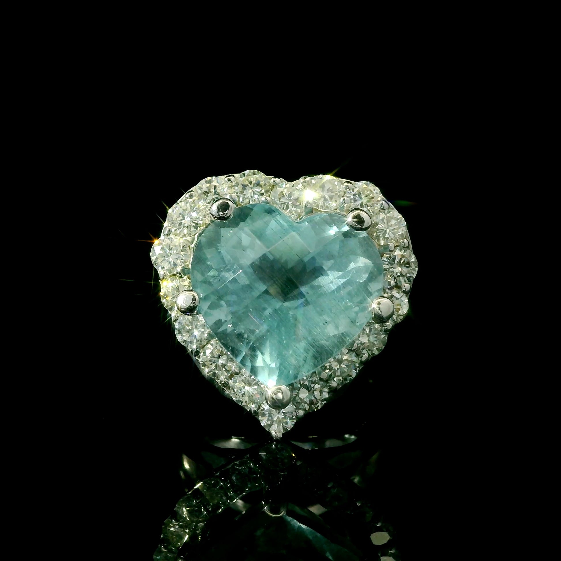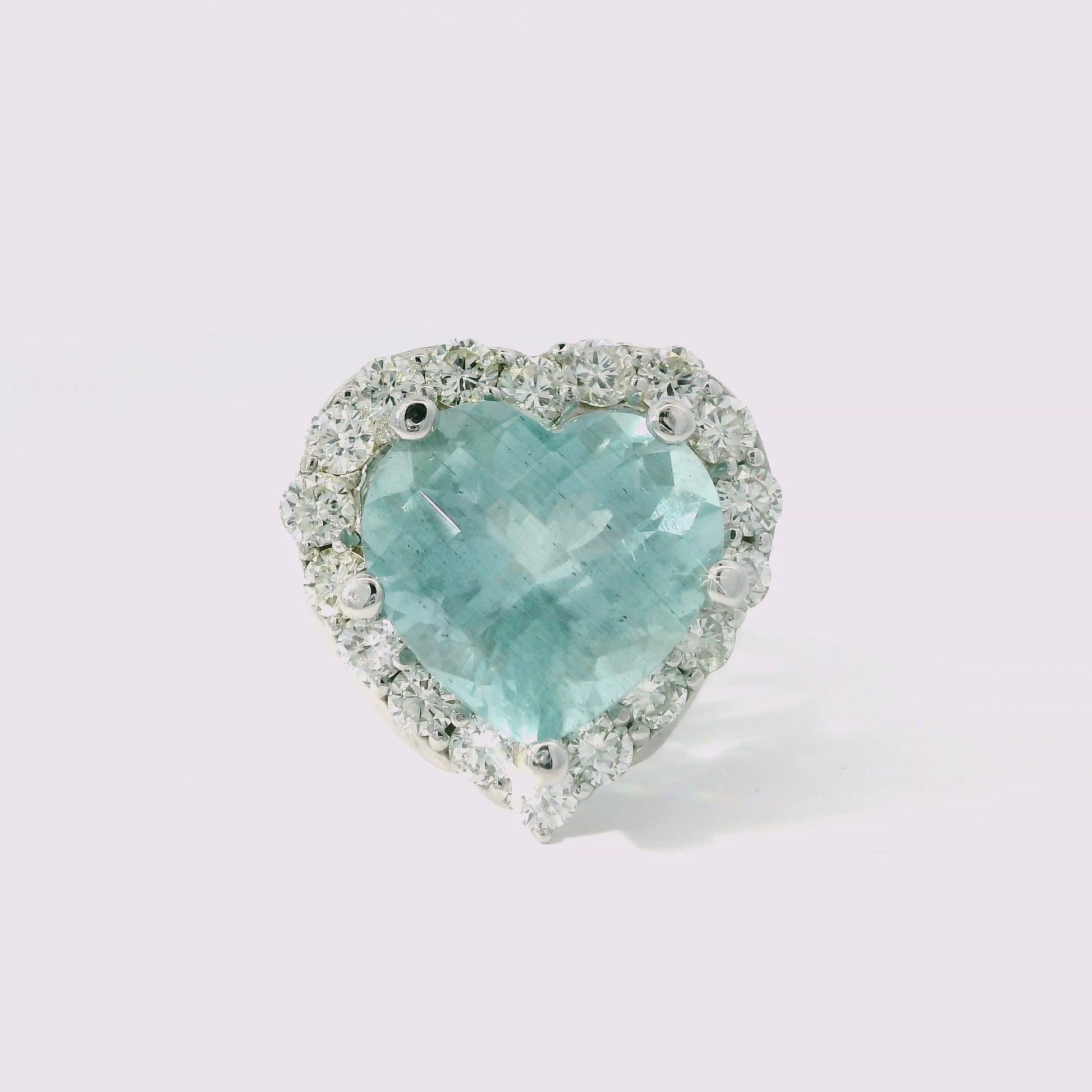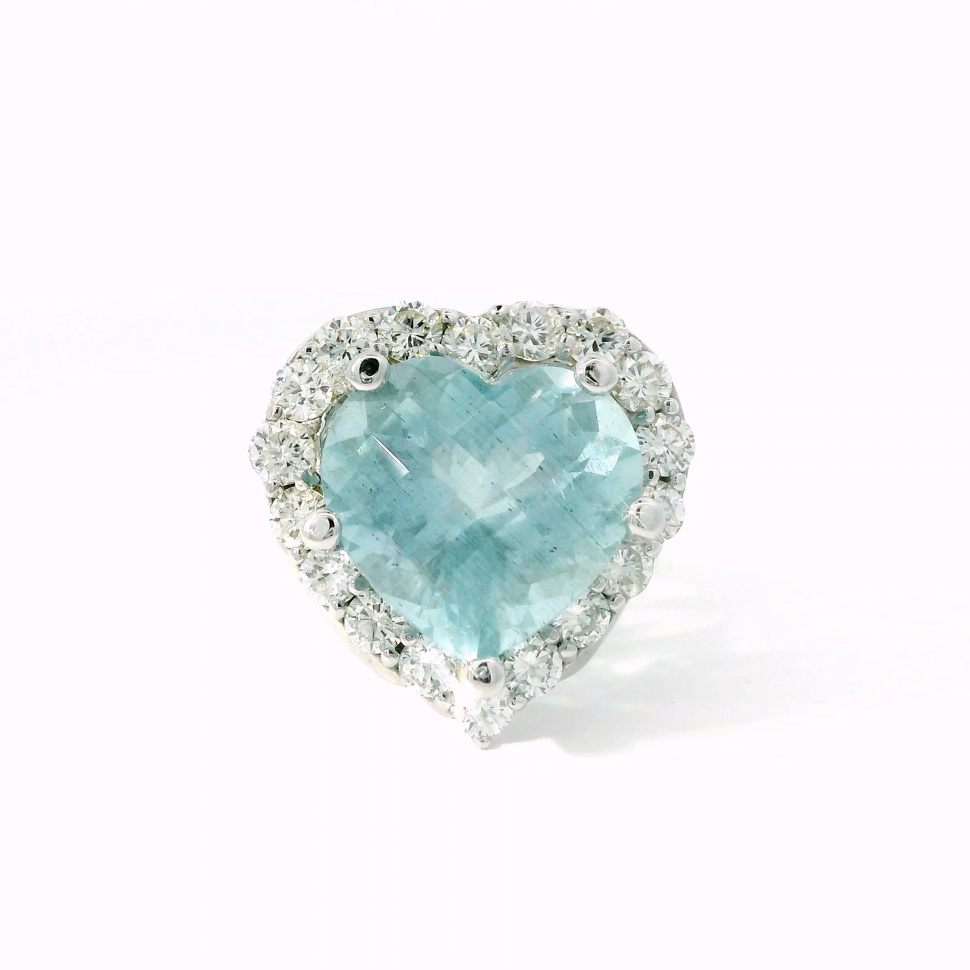 Romantic with a bold sparkle, this blue topaz and diamond heart ring is a timeless expression of love, elegance, and fine craftsmanship. At the center is a luminous natural heart-shaped blue topaz, prized for its tranquil ocean-blue color and captivating clarity. The gemstone is framed by a halo of natural diamonds, adding brilliance and contrast that amplifies the stone’s soft glow.