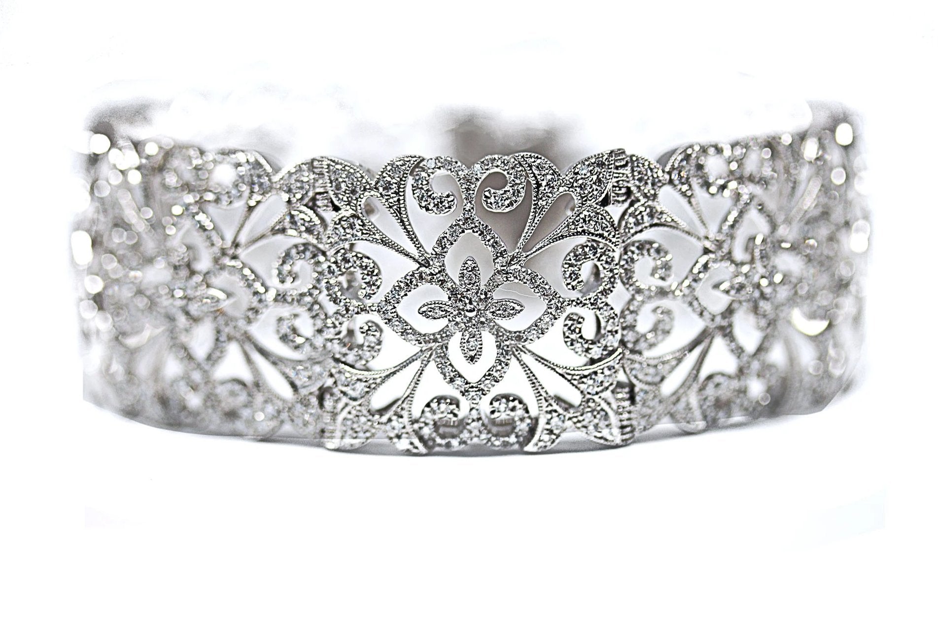 This is a vintage-inspired wide Bangle made with 396 Round Brilliant cut diamonds. There is Mil-grain surrounding the diamonds to give its victorian look and the width is 22mm. It fits a 6-7.5-inch wrist comfortably. Currently, this is only available in 14kt white gold but if you would like it in another metal or with different gemstones please contact us at billy@thediamondaire.com or call/Text (630)355-RING(7464).